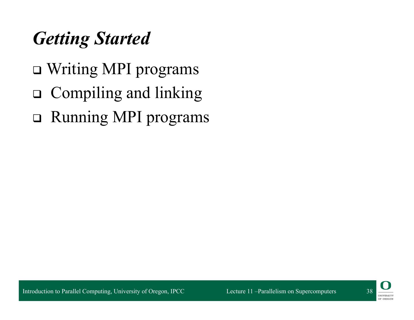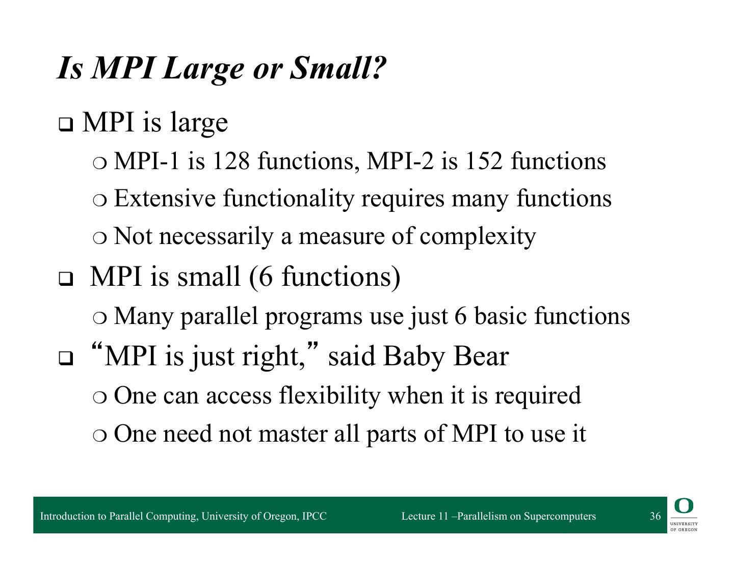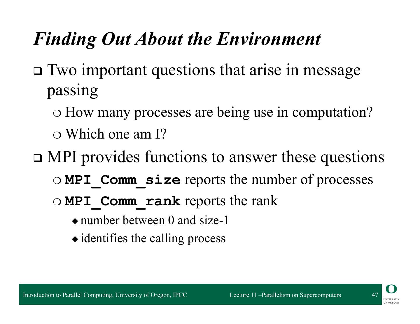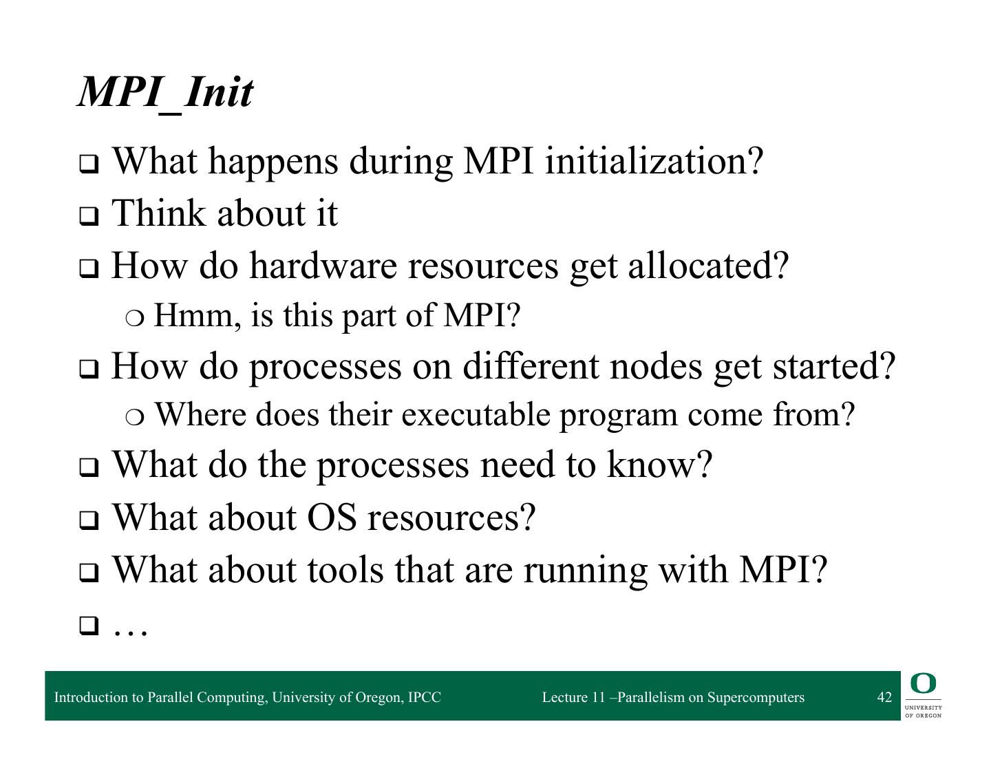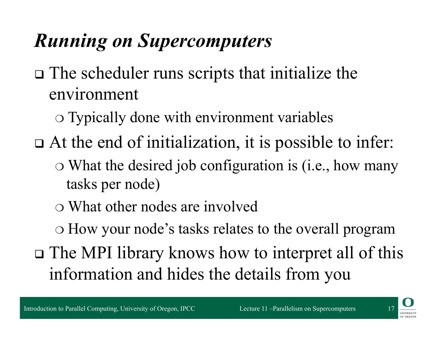 17 . Running on Supercomputers q The scheduler runs scripts that initialize the environment ❍ Typically done with environment variables q At the end of initialization, it is possible to infer: ❍ What the desired job configuration is (i.e., how many tasks per node) ❍ What other nodes are involved ❍ How your node’s tasks relates to the overall program q The MPI library knows how to interpret all of this information and hides the details from you Introduction to Parallel Computing, University of Oregon, IPCC Lecture 11 –Parallelism on Supercomputers 17