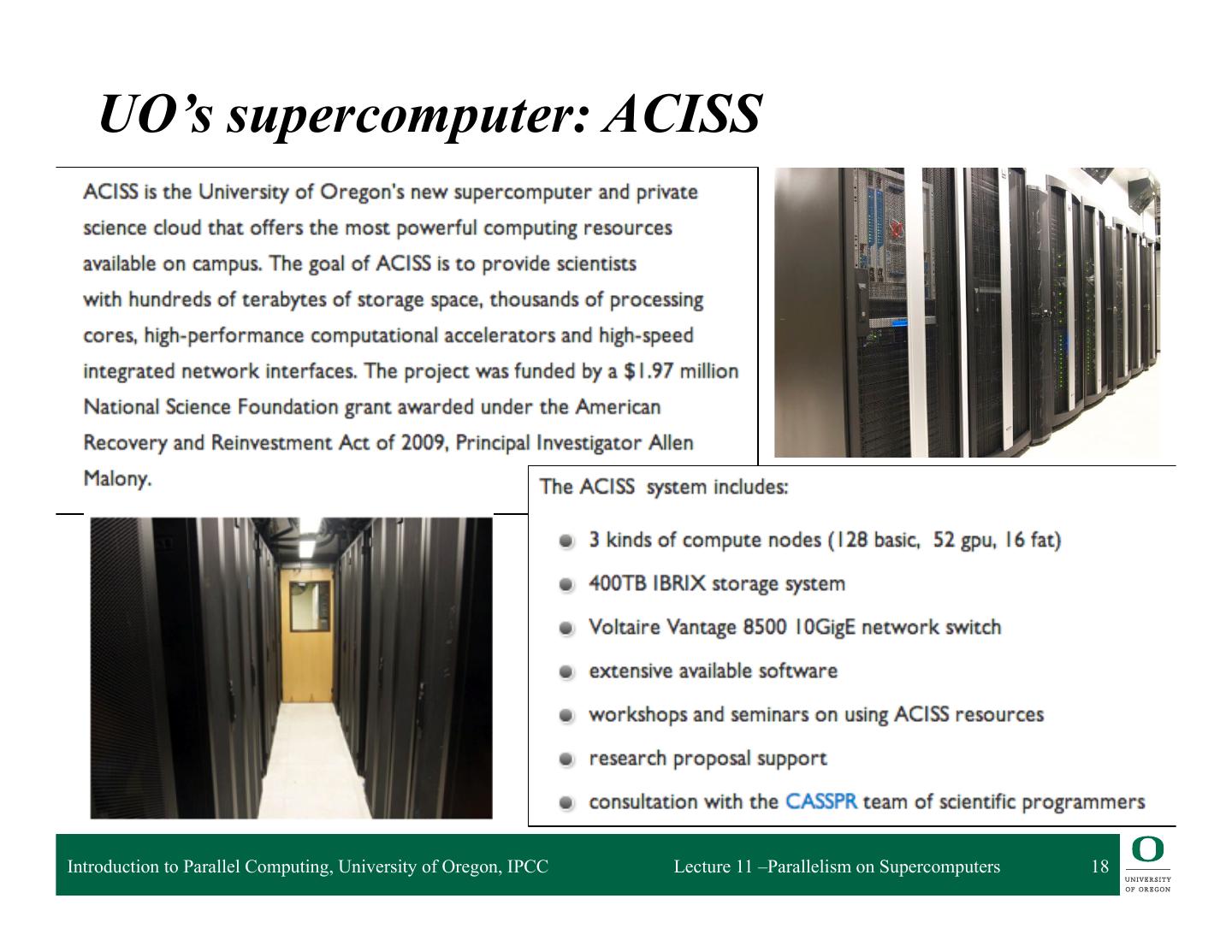 18 . UO’s supercomputer: ACISS Introduction to Parallel Computing, University of Oregon, IPCC Lecture 11 –Parallelism on Supercomputers 18