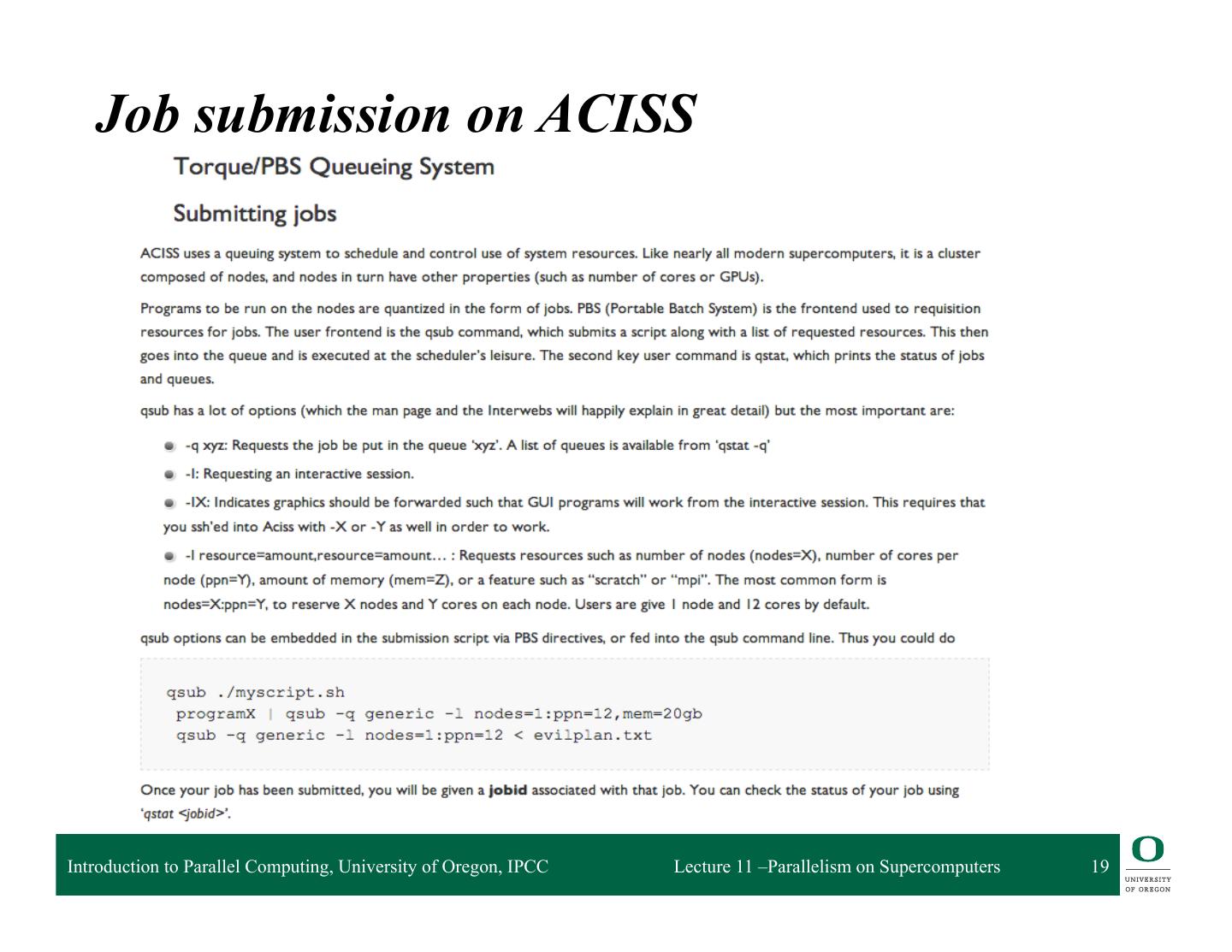 19 . Job submission on ACISS Introduction to Parallel Computing, University of Oregon, IPCC Lecture 11 –Parallelism on Supercomputers 19