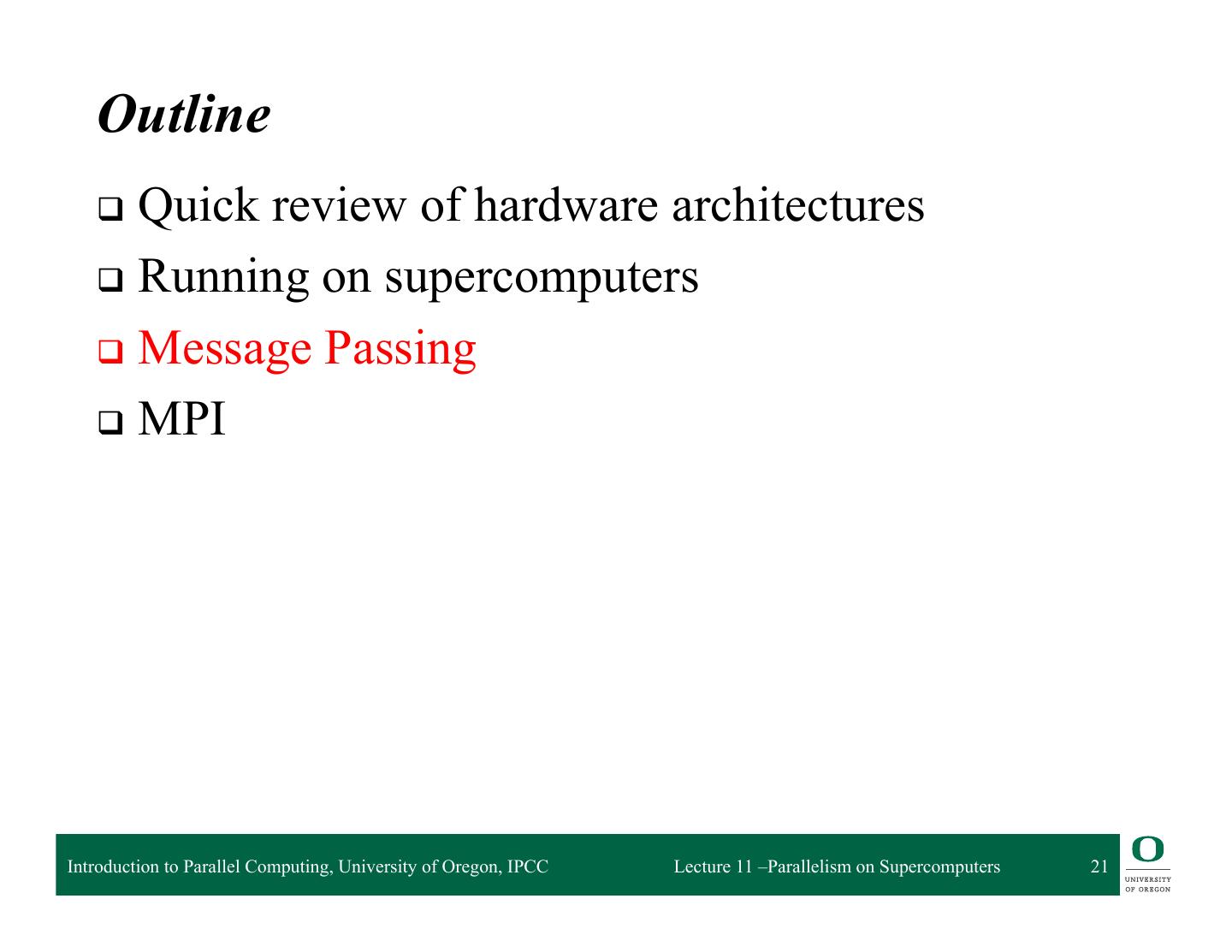 21 . Outline q Quickreview of hardware architectures q Running on supercomputers q Message Passing q MPI Introduction to Parallel Computing, University of Oregon, IPCC Lecture 11 –Parallelism on Supercomputers 21
