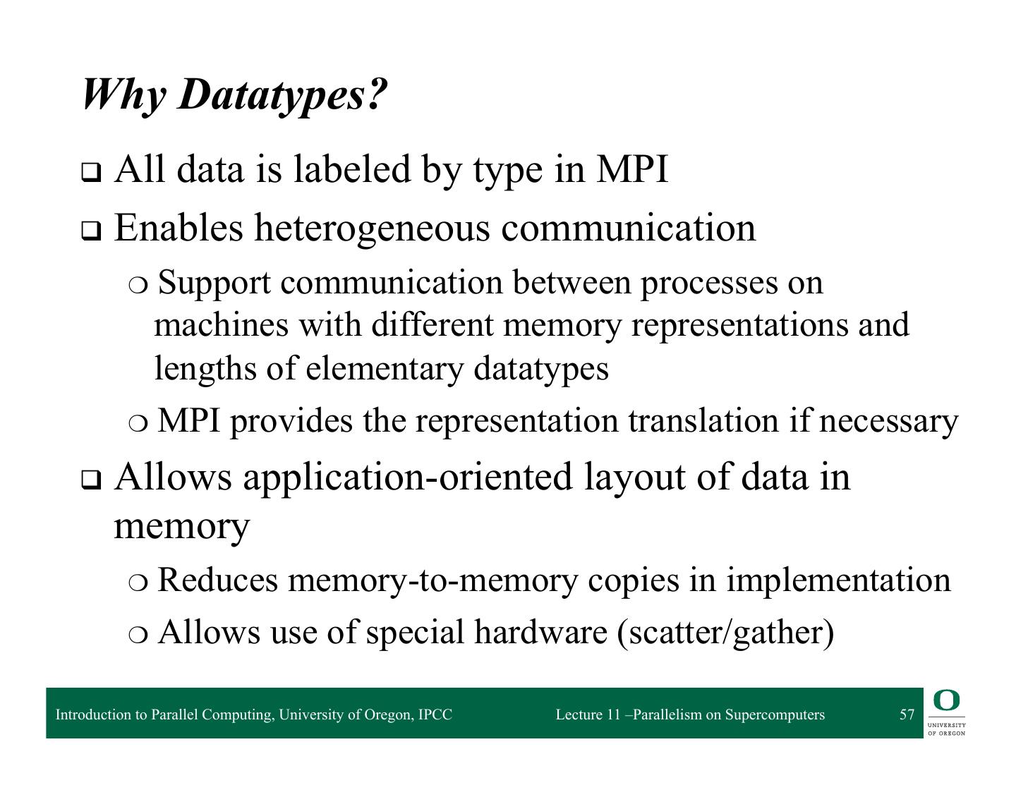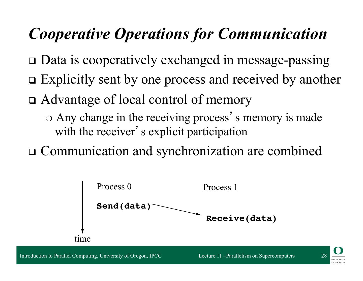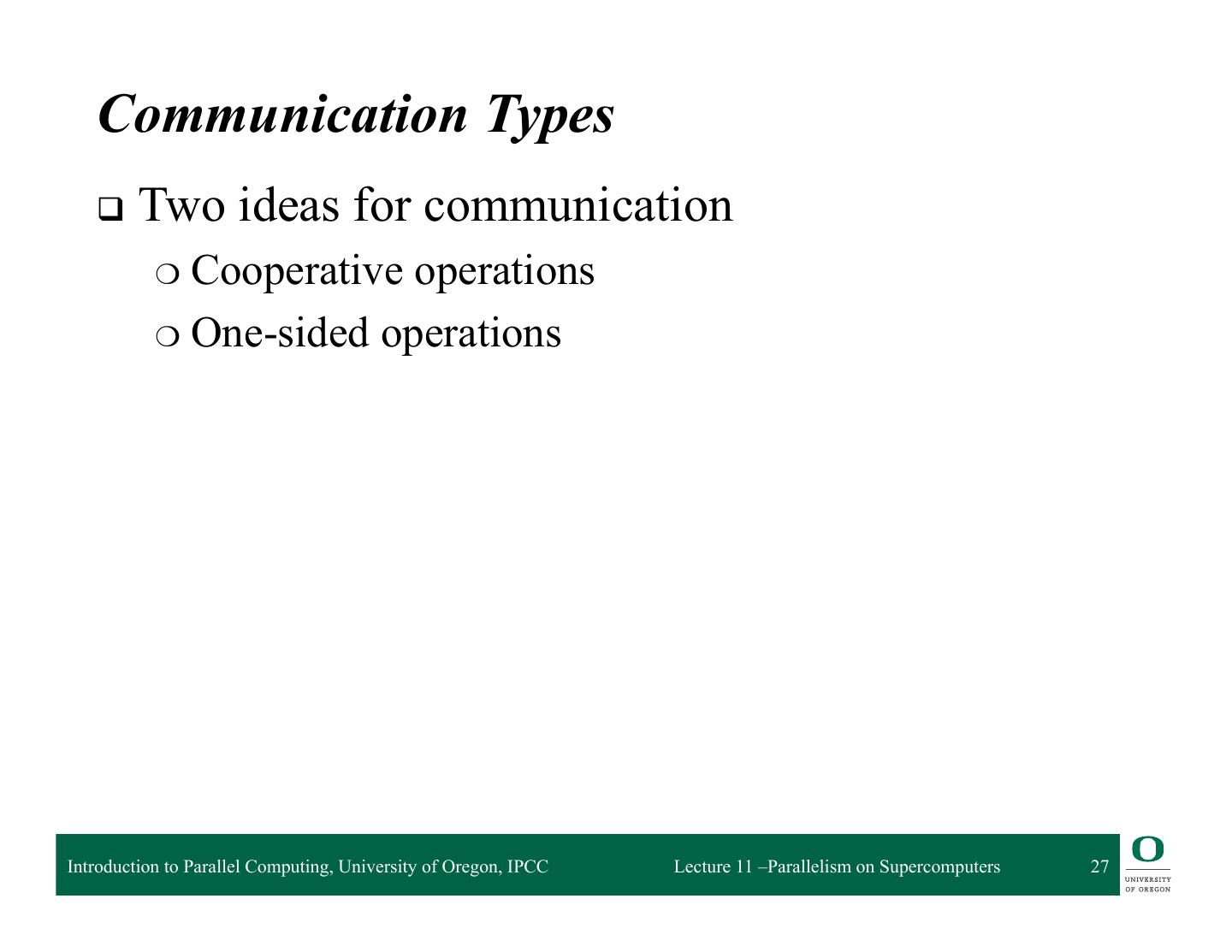 27 . Communication Types q Two ideas for communication ❍ Cooperative operations ❍ One-sided operations Introduction to Parallel Computing, University of Oregon, IPCC Lecture 11 –Parallelism on Supercomputers 27
