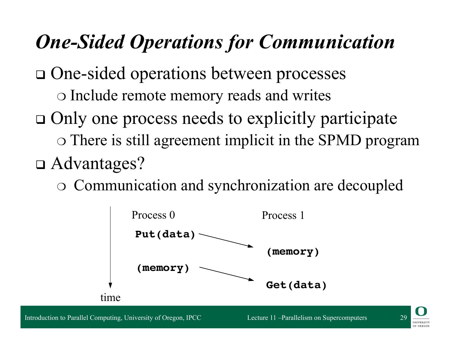 29 . One-Sided Operations for Communication q One-sided operations between processes ❍ Include remote memory reads and writes q Only one process needs to explicitly participate ❍ There is still agreement implicit in the SPMD program q Advantages? ❍ Communication and synchronization are decoupled Process 0 Process 1 Put(data) (memory) (memory)! Get(data) time Introduction to Parallel Computing, University of Oregon, IPCC Lecture 11 –Parallelism on Supercomputers 29