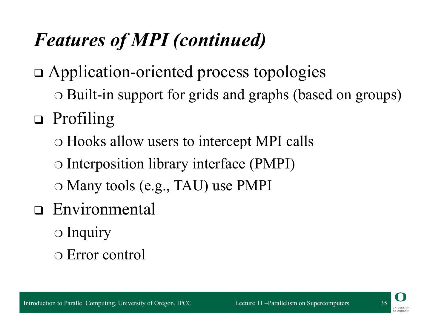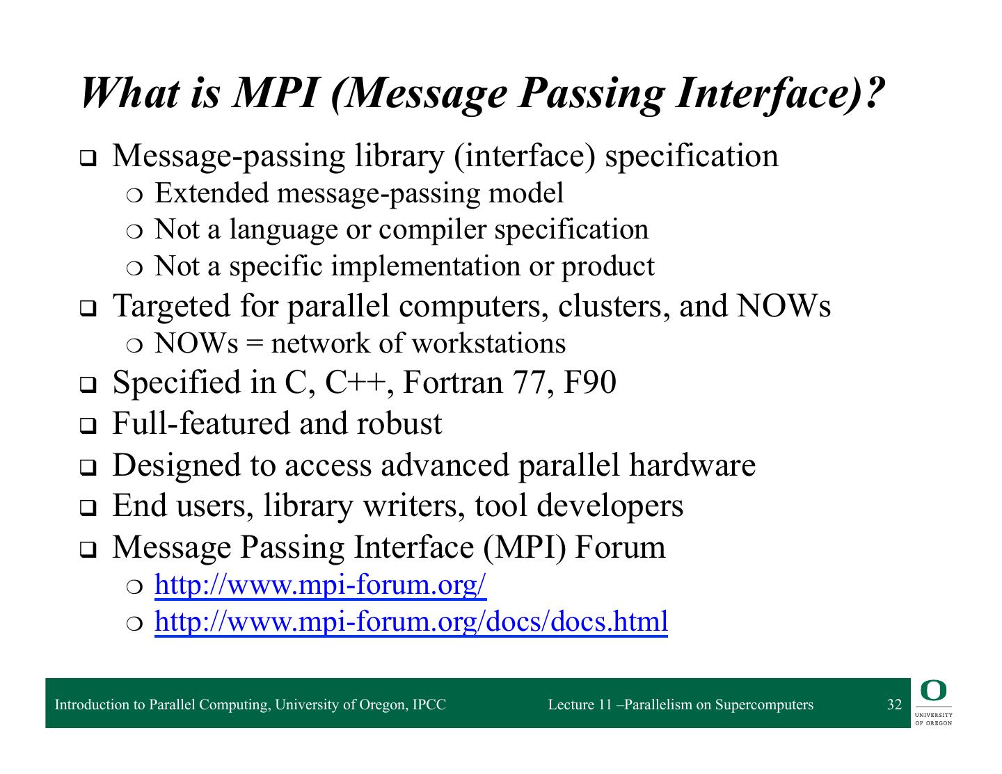 1 .Parallelism on Supercomputers and the Message Passing Interface (MPI) Parallel Computing CIS 410/510 Department of Computer and Information Science Lecture 11 –Parallelism on Supercomputers