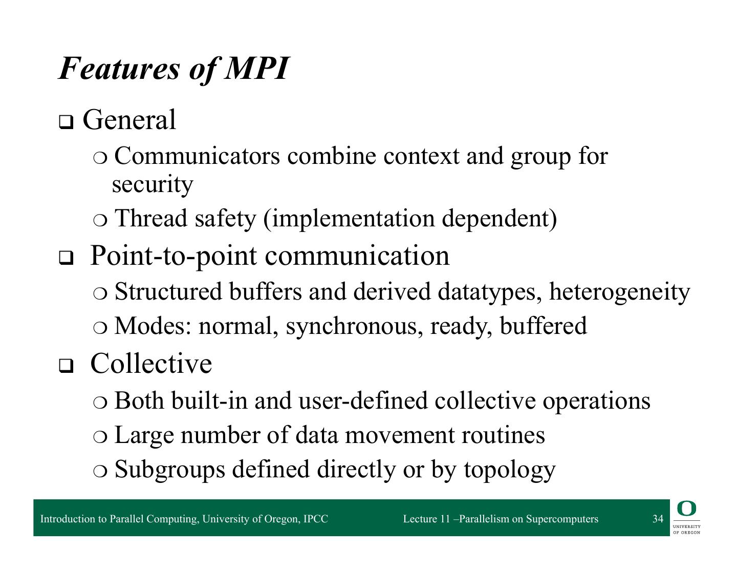 2 . Outline q Quickreview of hardware architectures q Running on supercomputers q Message Passing q MPI Introduction to Parallel Computing, University of Oregon, IPCC Lecture 11 –Parallelism on Supercomputers 2
