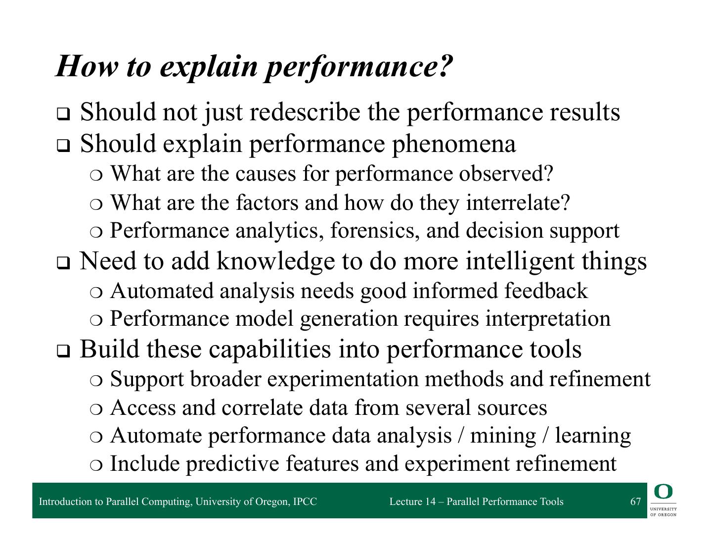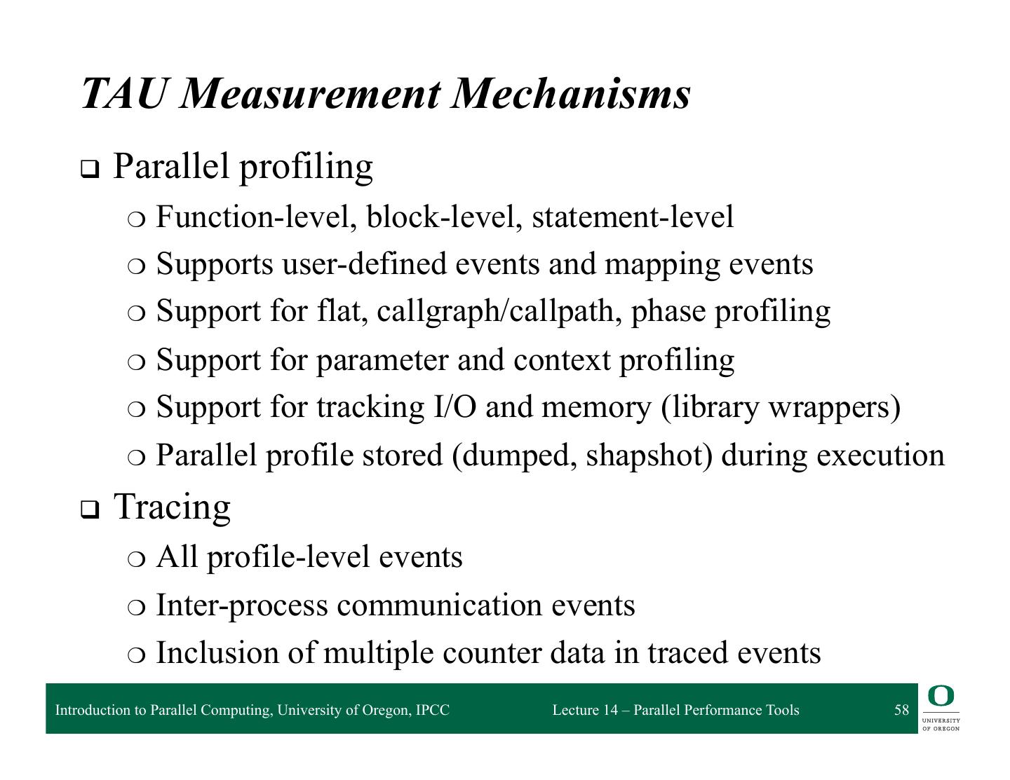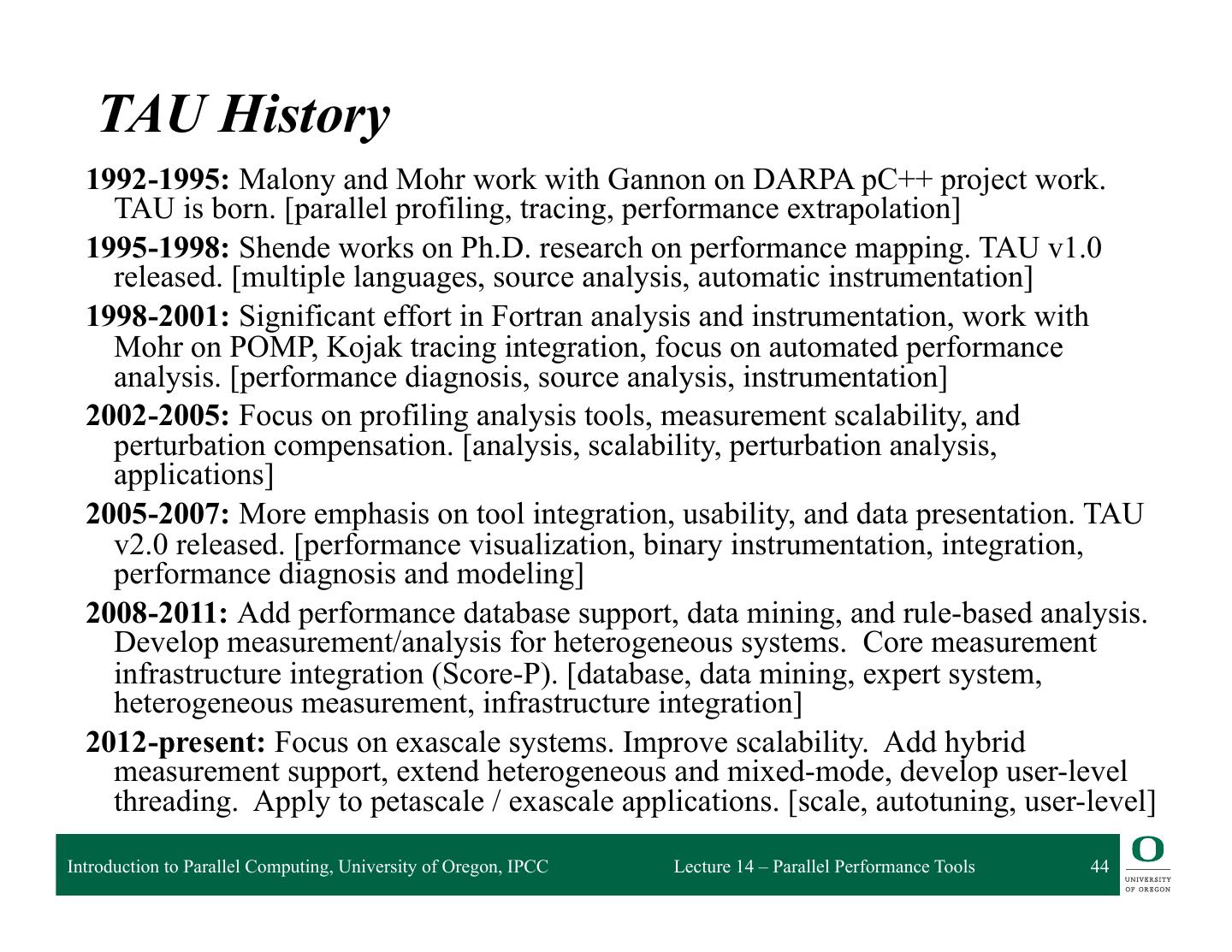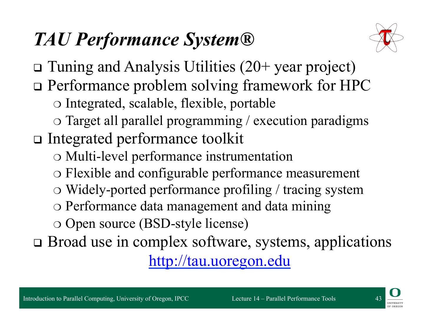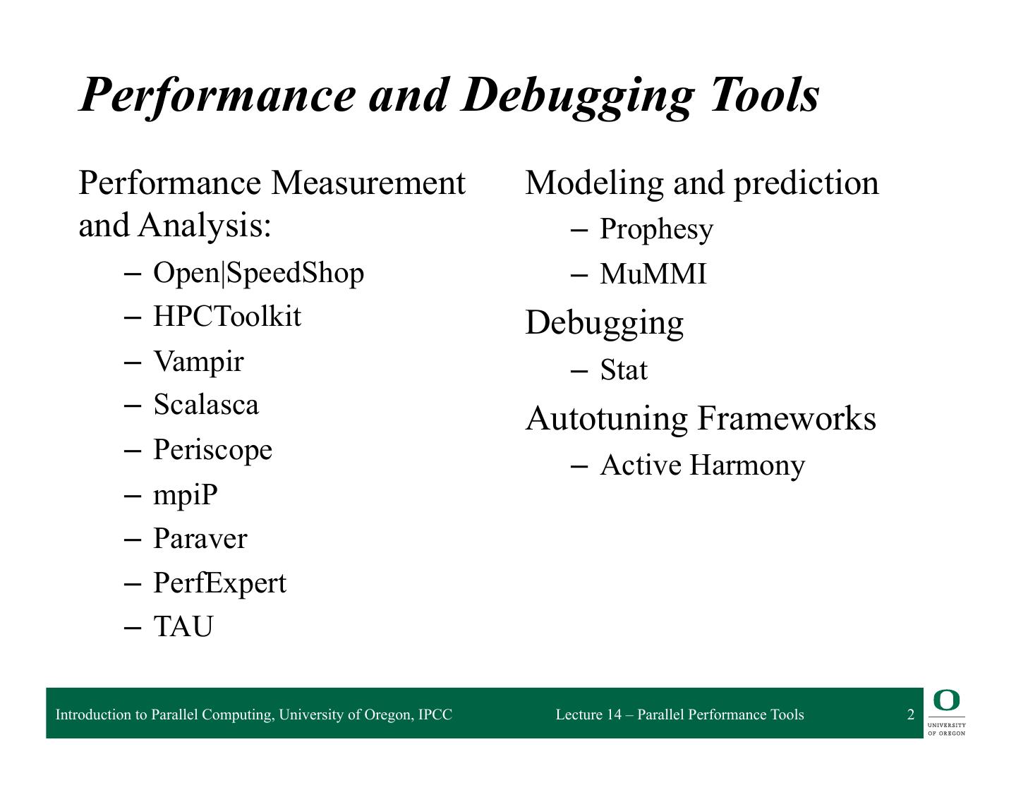 2 . Performance and Debugging Tools Performance Measurement Modeling and prediction and Analysis: – Prophesy – Open|SpeedShop – MuMMI – HPCToolkit Debugging – Vampir – Stat – Scalasca Autotuning Frameworks – Periscope – Active Harmony – mpiP – Paraver – PerfExpert – TAU Introduction to Parallel Computing, University of Oregon, IPCC Lecture 14 – Parallel Performance Tools 2