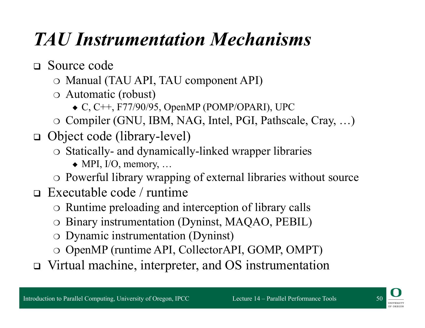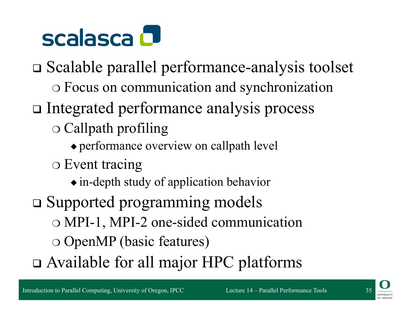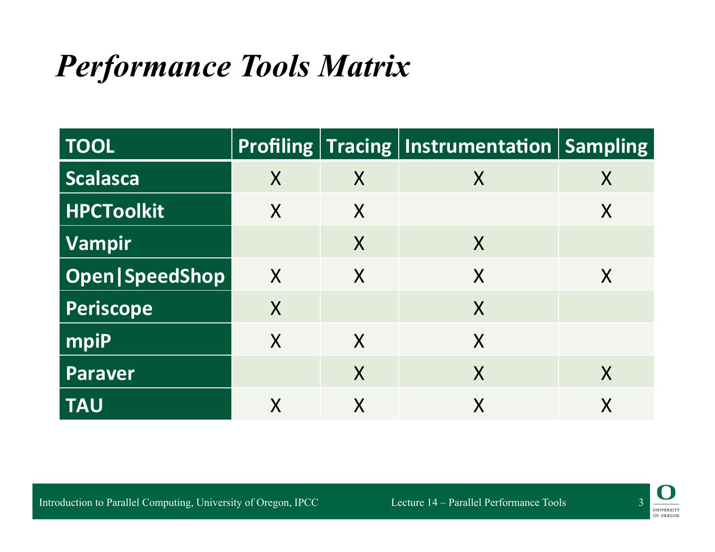 3 . Performance Tools Matrix TOOL Profiling Tracing Instrumenta5on Sampling Scalasca X X X X HPCToolkit X X X Vampir X X Open|SpeedShop X X X X Periscope X X mpiP X X X Paraver X X X TAU X X X X Introduction to Parallel Computing, University of Oregon, IPCC Lecture 14 – Parallel Performance Tools 3
