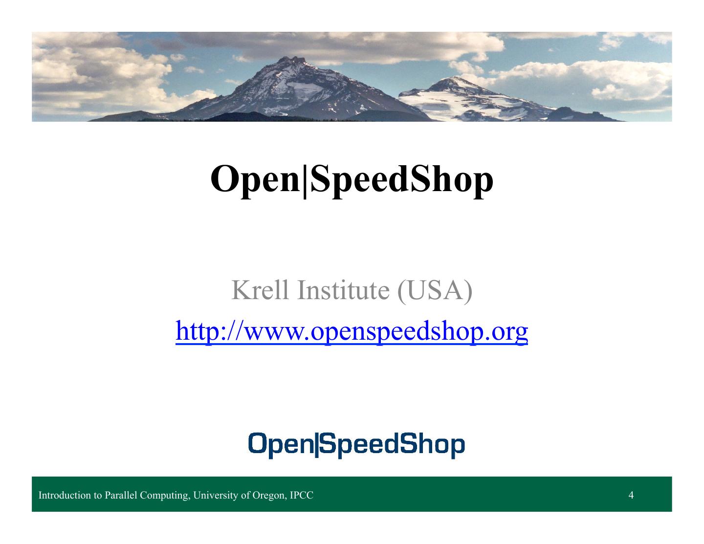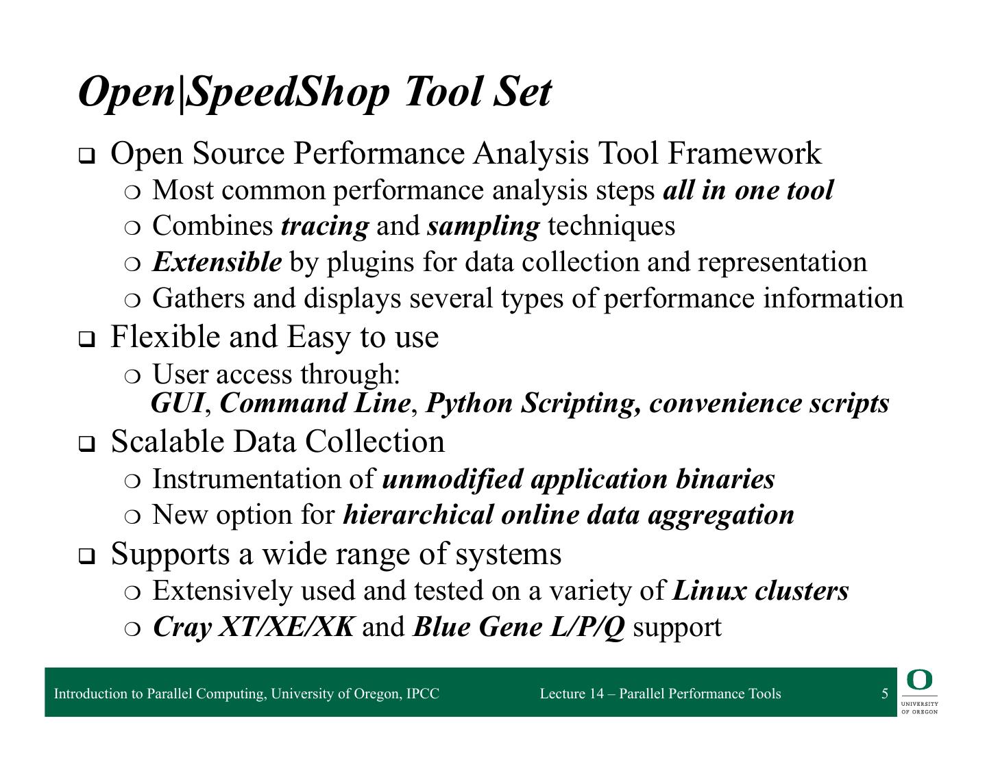 4 . Open|SpeedShop Krell Institute (USA) http://www.openspeedshop.org Introduction to Parallel Computing, University of Oregon, IPCC Lecture 14 – Parallel Performance Tools 4