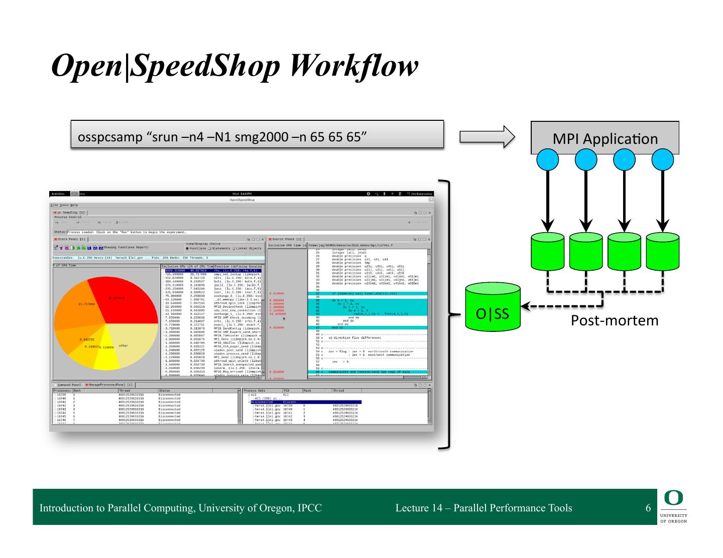 5 . Open|SpeedShop Tool Set q Open Source Performance Analysis Tool Framework ❍ Most common performance analysis steps all in one tool ❍ Combines tracing and sampling techniques ❍ Extensible by plugins for data collection and representation ❍ Gathers and displays several types of performance information q Flexible and Easy to use ❍ User access through: GUI, Command Line, Python Scripting, convenience scripts q Scalable Data Collection ❍ Instrumentation of unmodified application binaries ❍ New option for hierarchical online data aggregation q Supports a wide range of systems ❍ Extensively used and tested on a variety of Linux clusters ❍ Cray XT/XE/XK and Blue Gene L/P/Q support Introduction to Parallel Computing, University of Oregon, IPCC Lecture 14 – Parallel Performance Tools 5