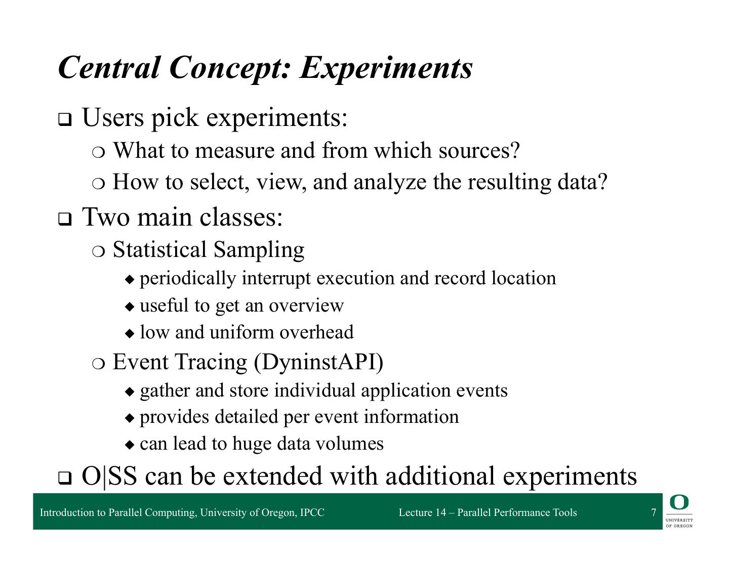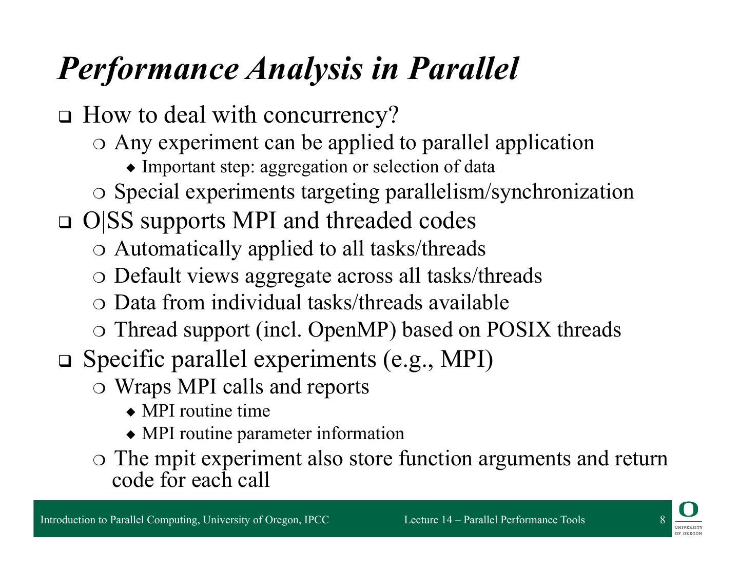 7 . Central Concept: Experiments q Users pick experiments: ❍ What to measure and from which sources? ❍ How to select, view, and analyze the resulting data? q Two main classes: ❍ Statistical Sampling ◆ periodically interrupt execution and record location ◆ useful to get an overview ◆ low and uniform overhead ❍ Event Tracing (DyninstAPI) ◆ gather and store individual application events ◆ provides detailed per event information ◆ can lead to huge data volumes q O|SS can be extended with additional experiments Introduction to Parallel Computing, University of Oregon, IPCC Lecture 14 – Parallel Performance Tools 7