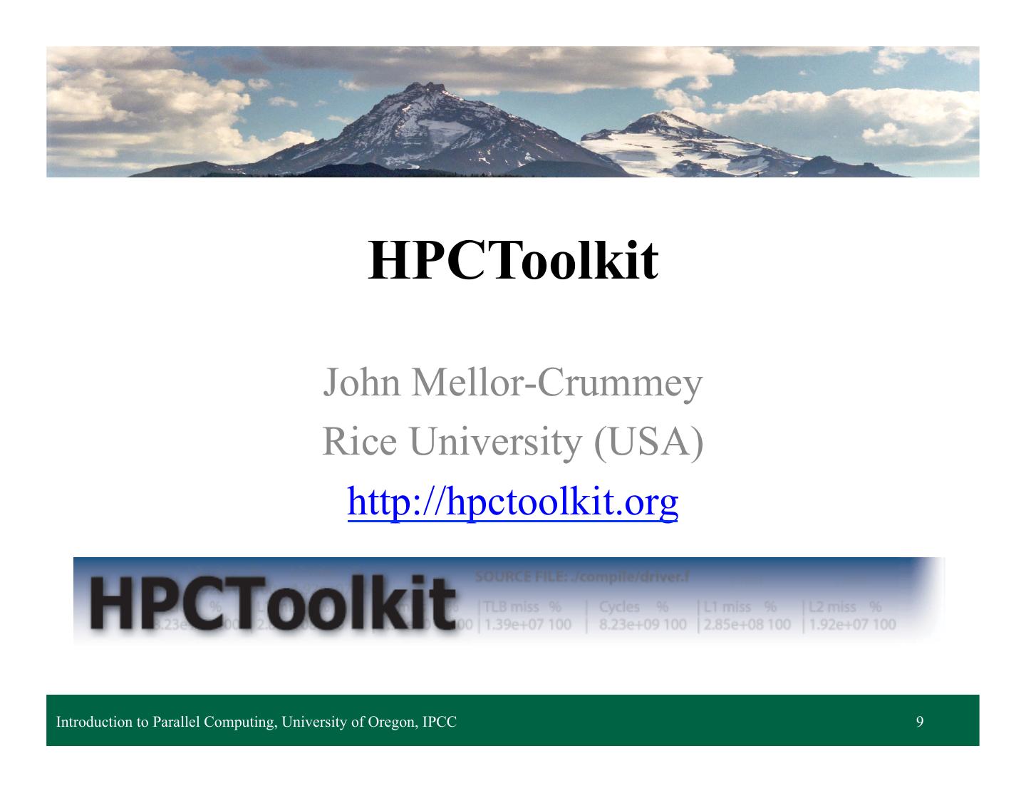 9 . HPCToolkit John Mellor-Crummey Rice University (USA) http://hpctoolkit.org Introduction to Parallel Computing, University of Oregon, IPCC Lecture 14 – Parallel Performance Tools 9