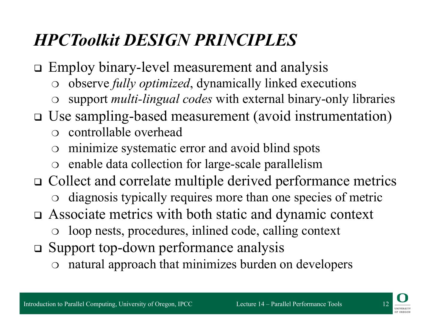 10 . HPCToolkit q Integrated suite of tools for measurement and analysis of program performance q Works with multilingual, fully optimized applications that are statically or dynamically linked q Sampling-based measurement methodology q Serial, multiprocess, multithread applications Introduction to Parallel Computing, University of Oregon, IPCC Lecture 14 – Parallel Performance Tools 10