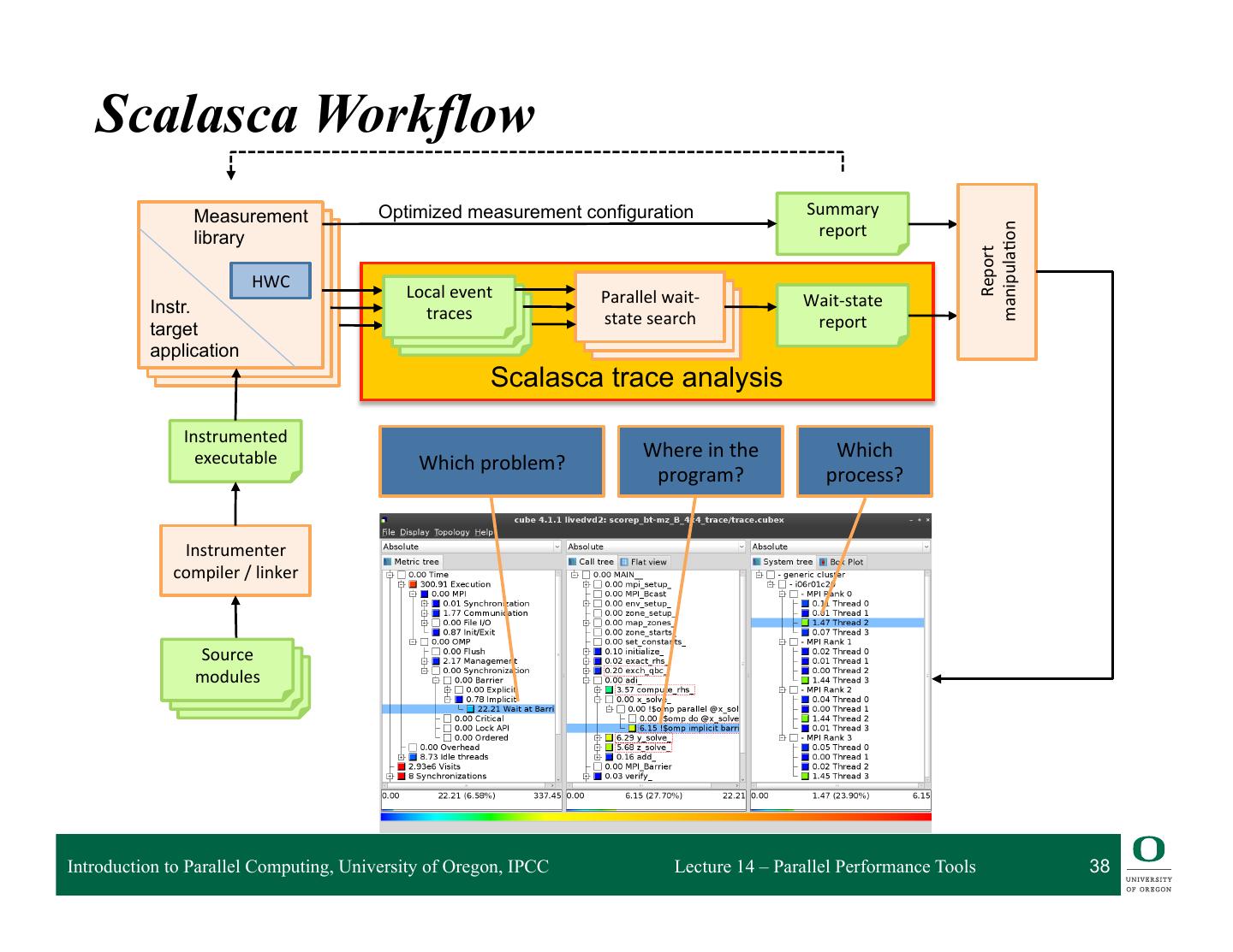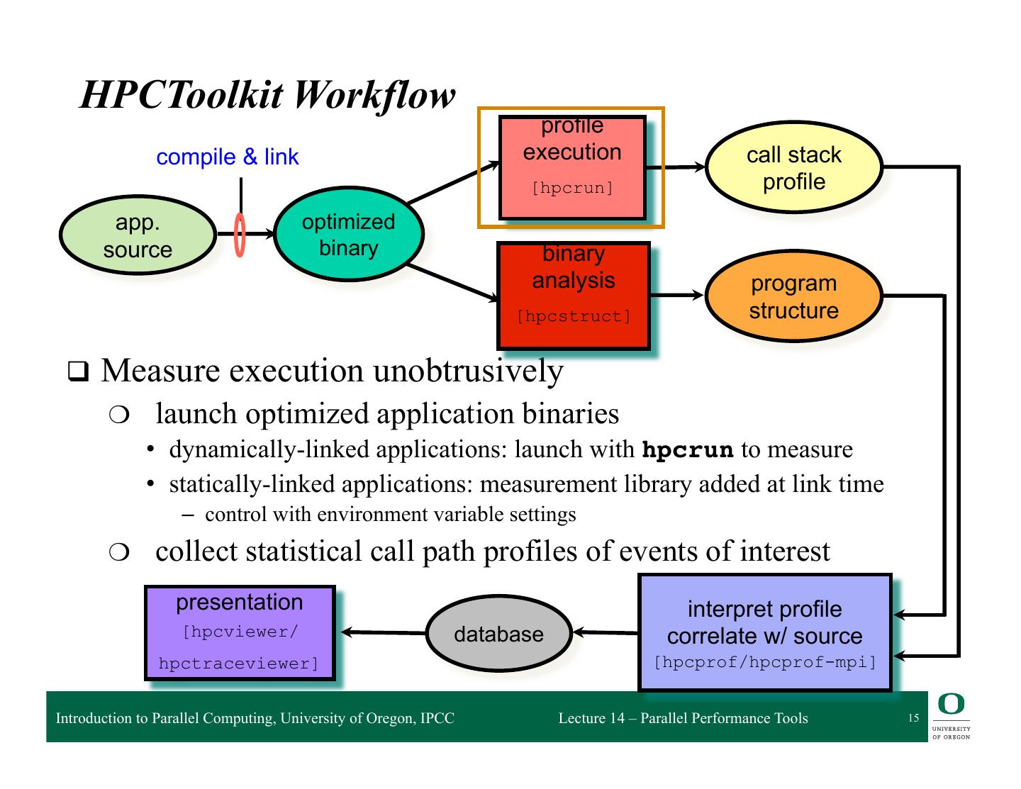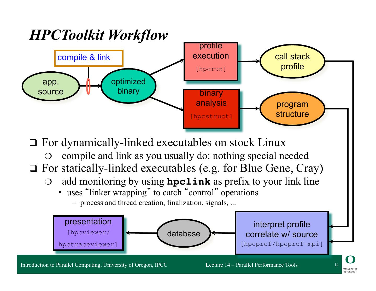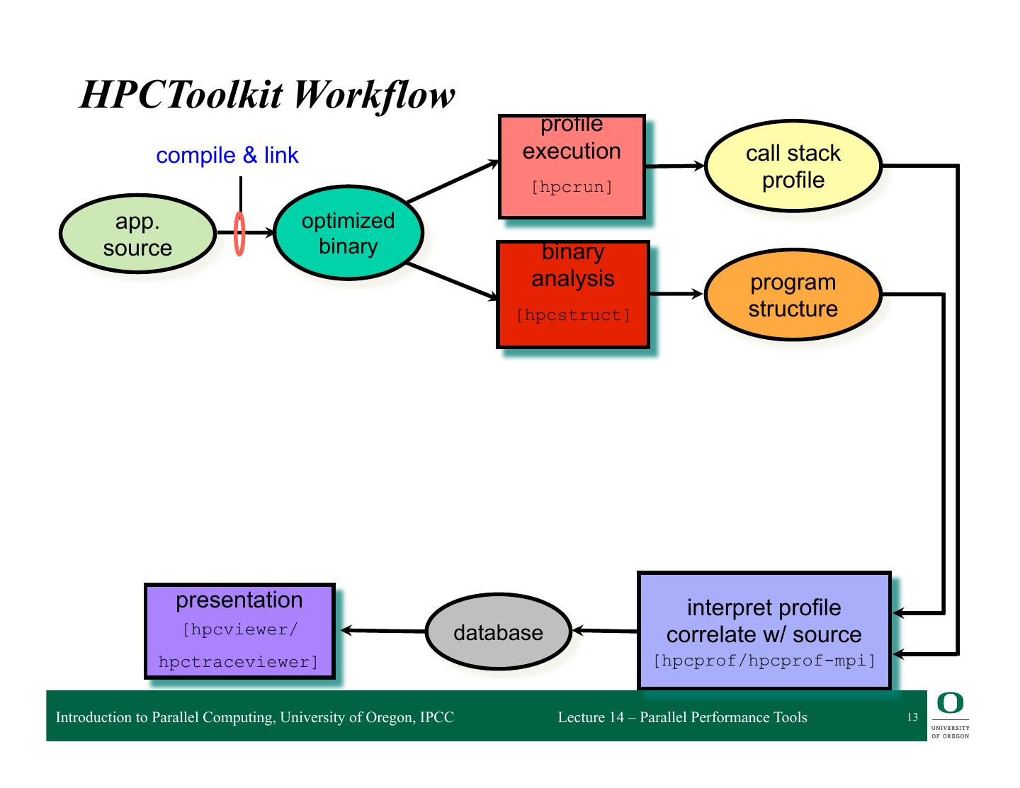 13 . HPCToolkit Workflow profile compile & link execution call stack [hpcrun] profile app. optimized source binary binary analysis program [hpcstruct] structure presentation interpret profile [hpcviewer/ database correlate w/ source hpctraceviewer] [hpcprof/hpcprof-mpi] Introduction to Parallel Computing, University of Oregon, IPCC Lecture 14 – Parallel Performance Tools 13