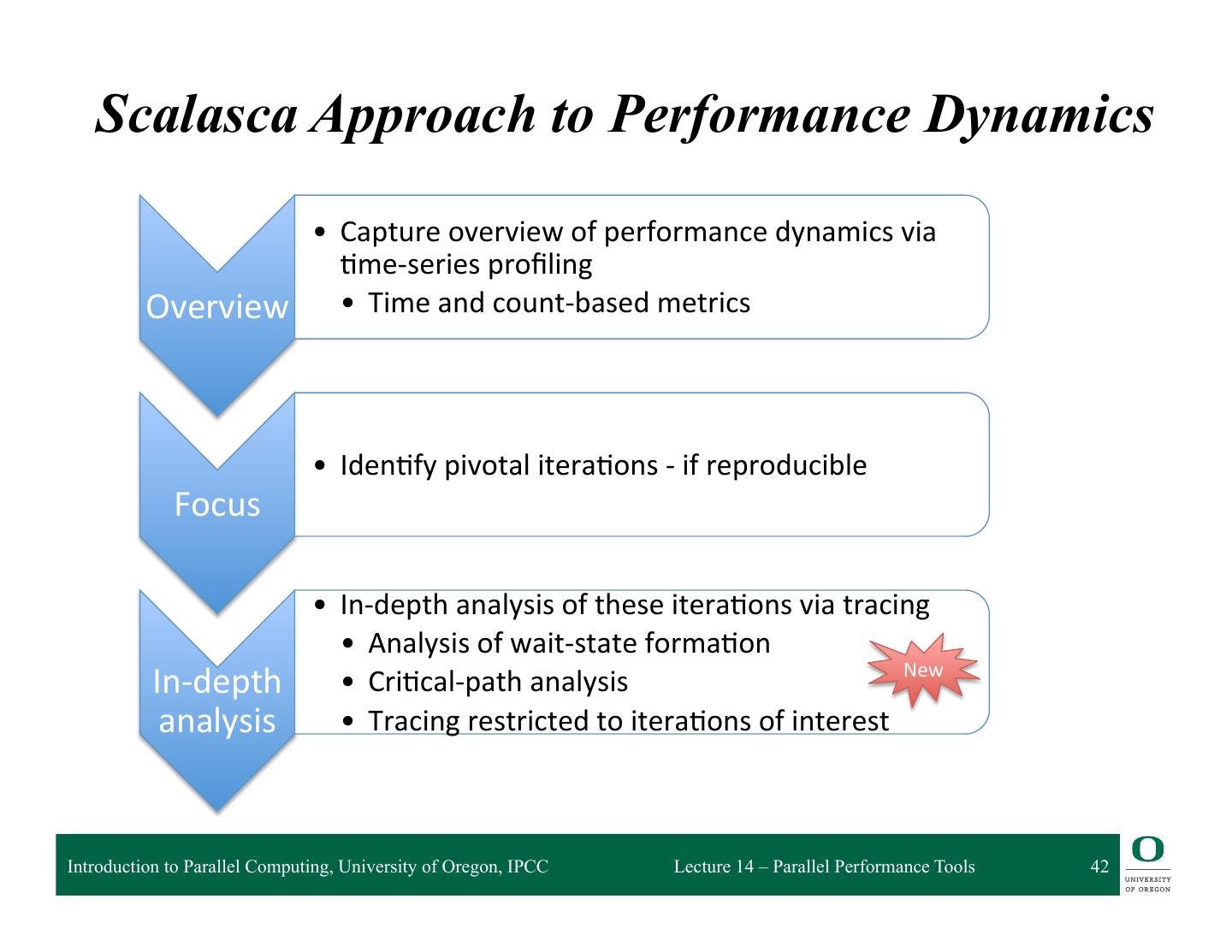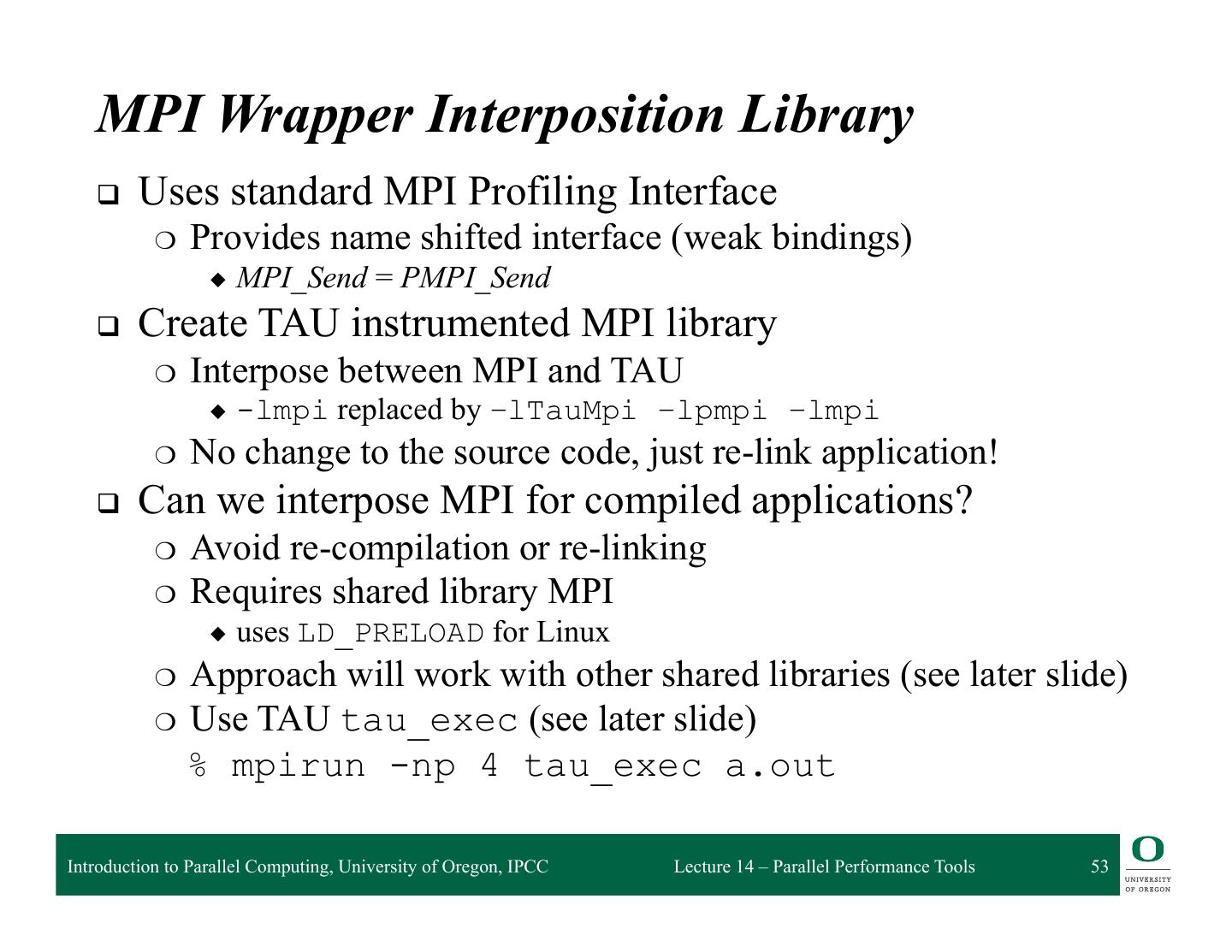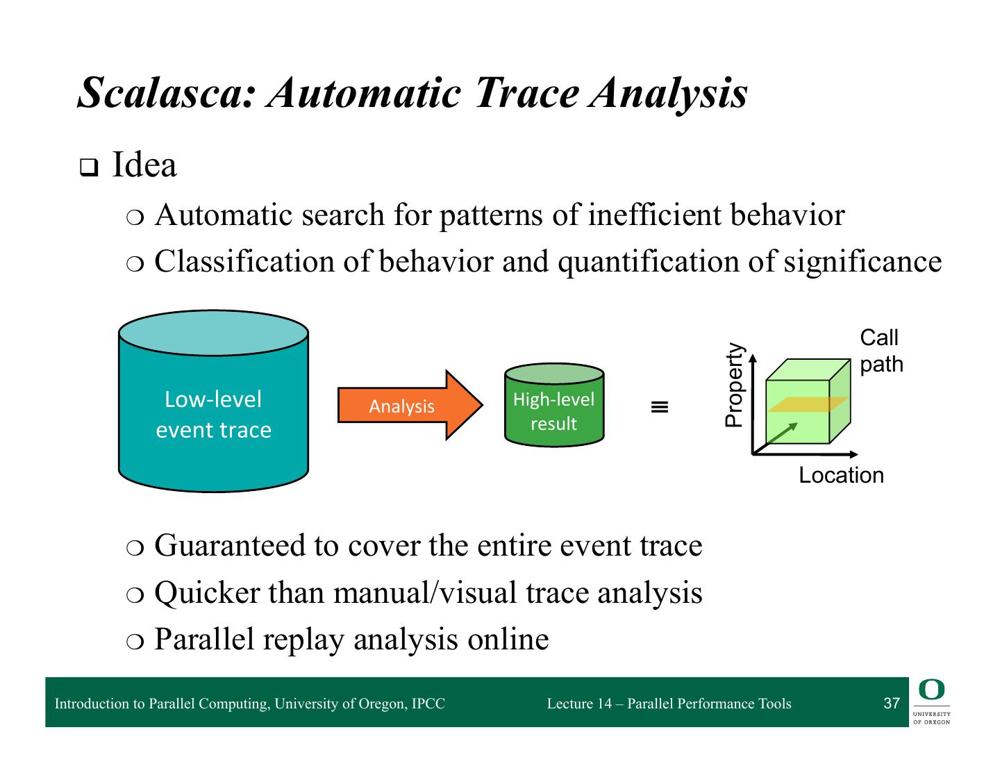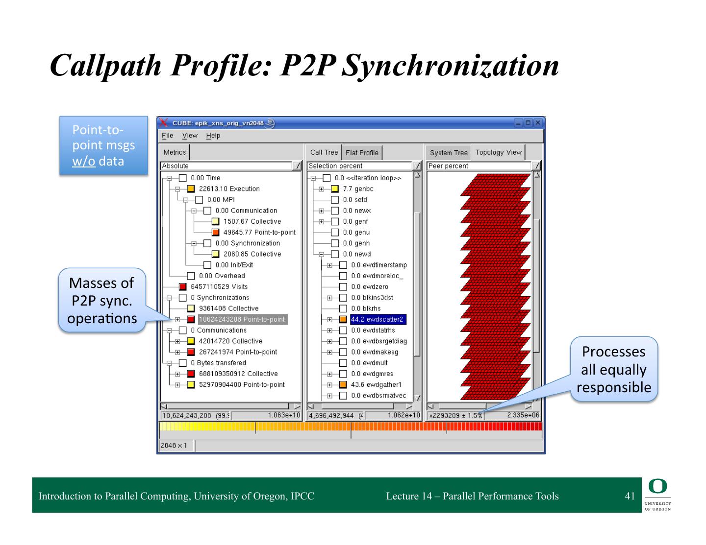 13 . HPCToolkit Workflow profile compile & link execution call stack [hpcrun] profile app. optimized source binary binary analysis program [hpcstruct] structure presentation interpret profile [hpcviewer/ database correlate w/ source hpctraceviewer] [hpcprof/hpcprof-mpi] Introduction to Parallel Computing, University of Oregon, IPCC Lecture 14 – Parallel Performance Tools 13