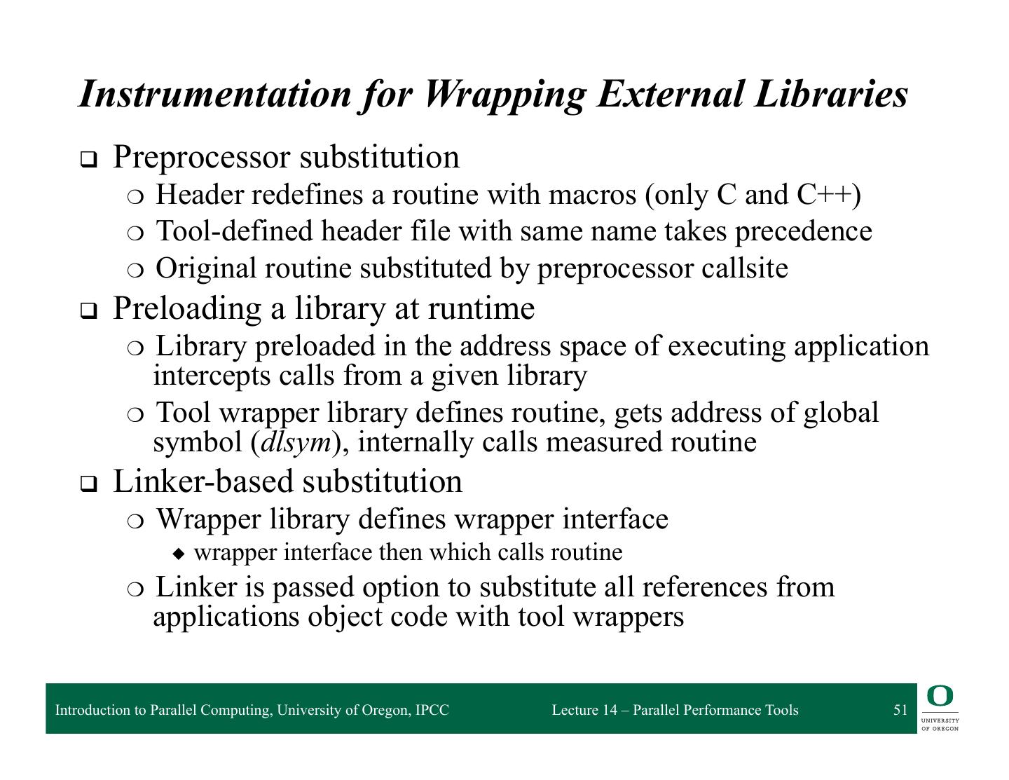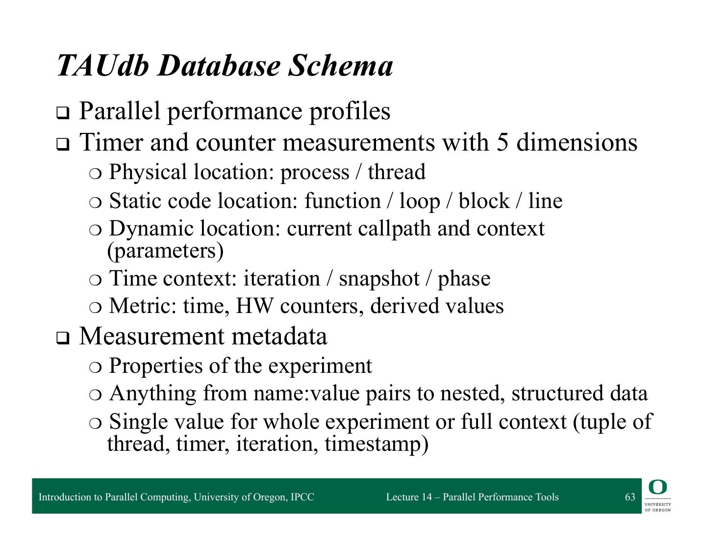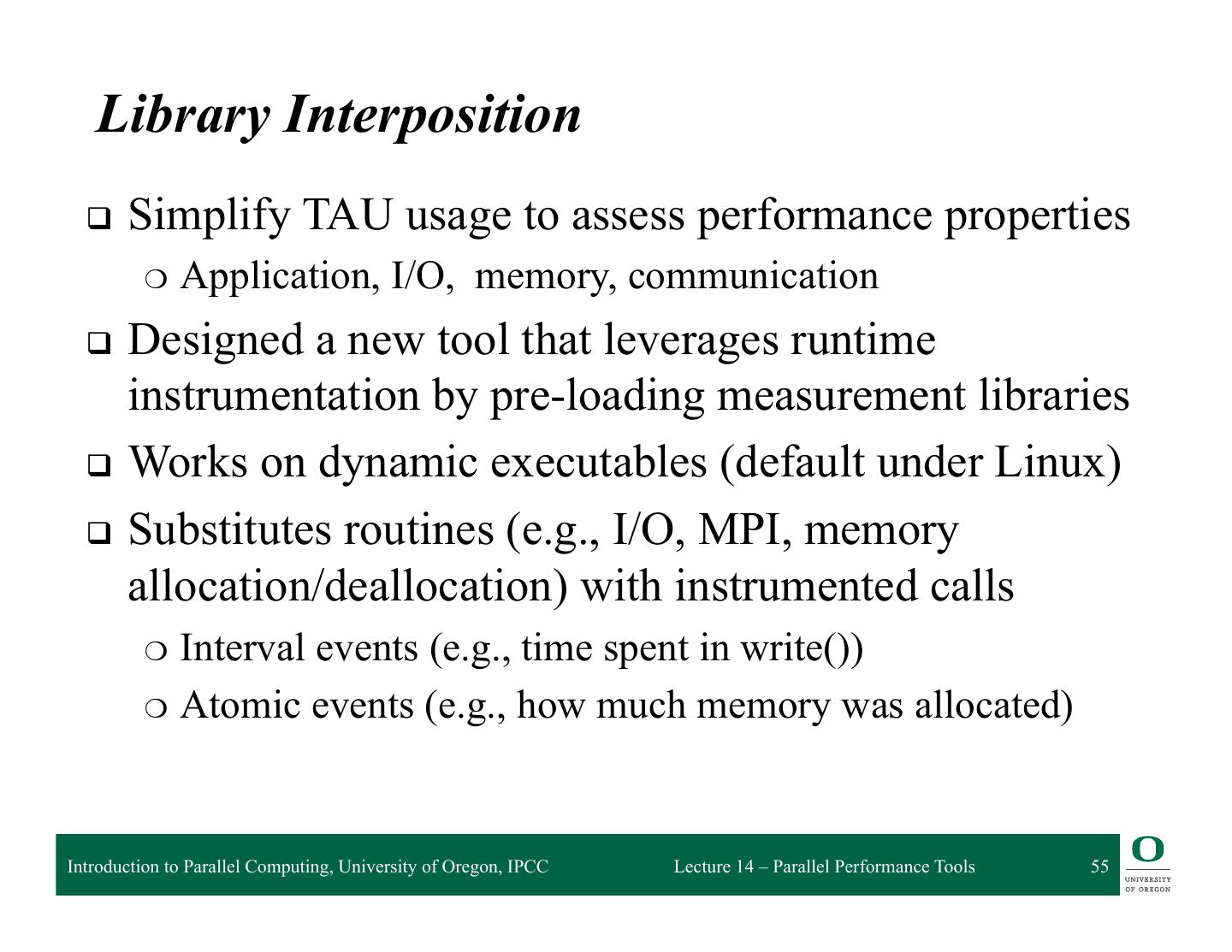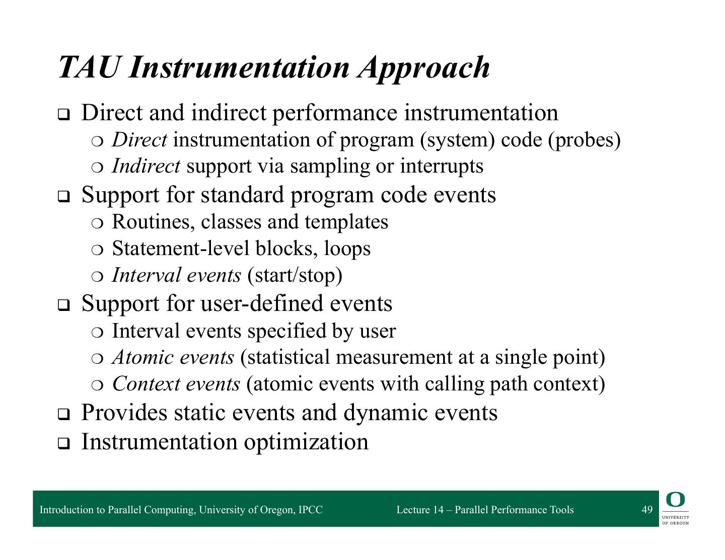 13 . HPCToolkit Workflow profile compile & link execution call stack [hpcrun] profile app. optimized source binary binary analysis program [hpcstruct] structure presentation interpret profile [hpcviewer/ database correlate w/ source hpctraceviewer] [hpcprof/hpcprof-mpi] Introduction to Parallel Computing, University of Oregon, IPCC Lecture 14 – Parallel Performance Tools 13