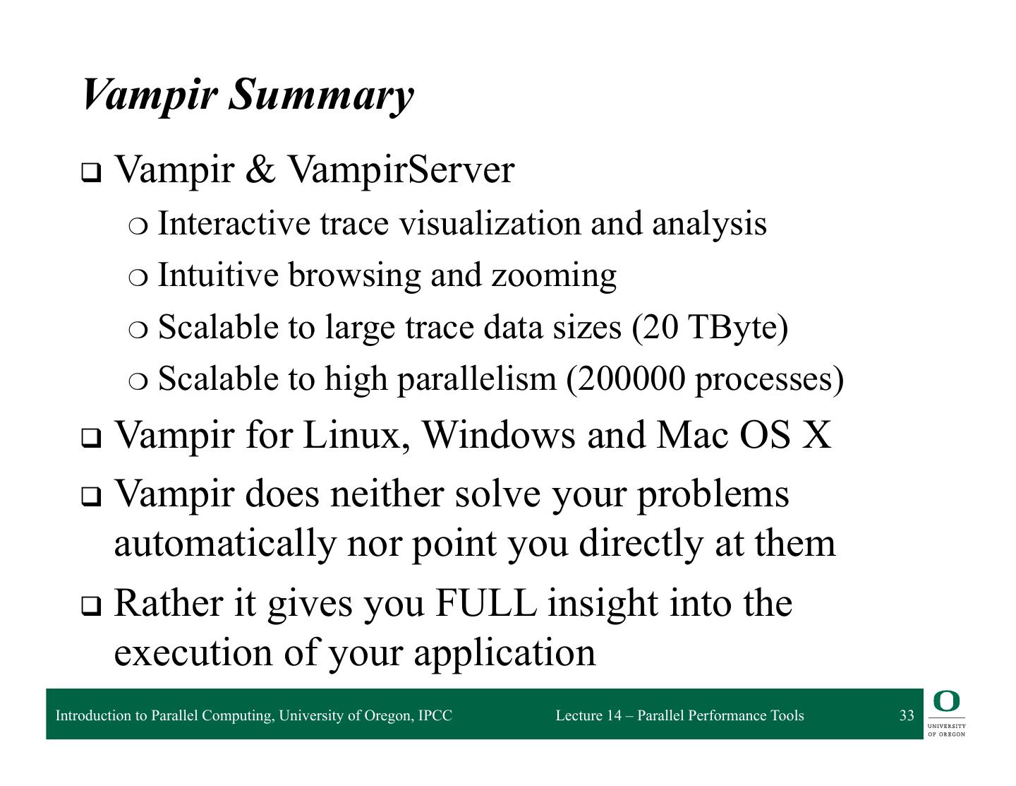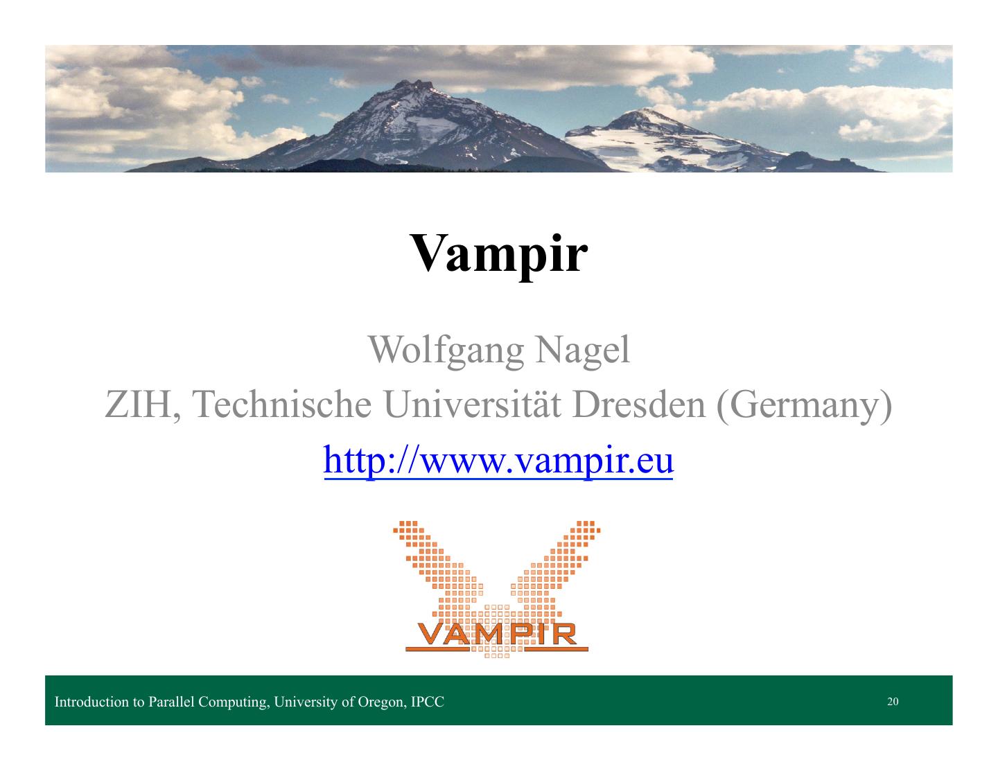 20 . Vampir Wolfgang Nagel ZIH, Technische Universität Dresden (Germany) http://www.vampir.eu Introduction to Parallel Computing, University of Oregon, IPCC Lecture 14 – Parallel Performance Tools 20