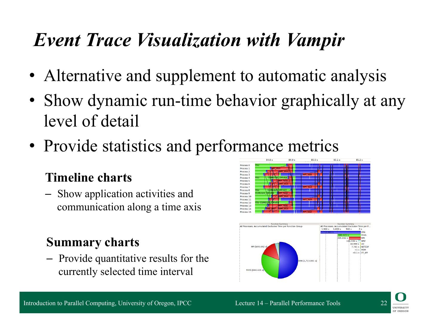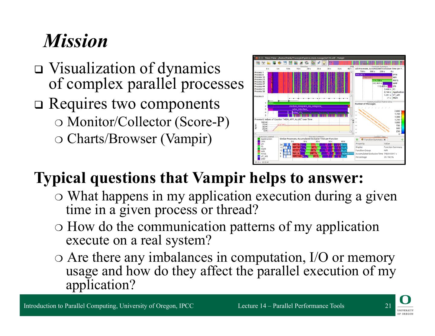 21 . Mission q Visualization of dynamics of complex parallel processes q Requires two components ❍ Monitor/Collector (Score-P) ❍ Charts/Browser (Vampir) Typical questions that Vampir helps to answer: ❍ What happens in my application execution during a given time in a given process or thread? ❍ How do the communication patterns of my application execute on a real system? ❍ Are there any imbalances in computation, I/O or memory usage and how do they affect the parallel execution of my application? Introduction to Parallel Computing, University of Oregon, IPCC Lecture 14 – Parallel Performance Tools 21