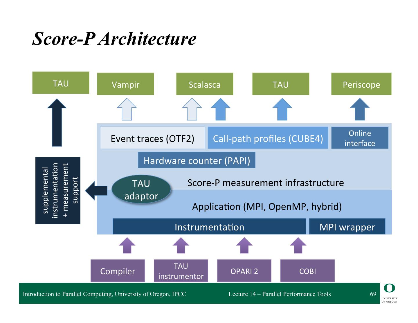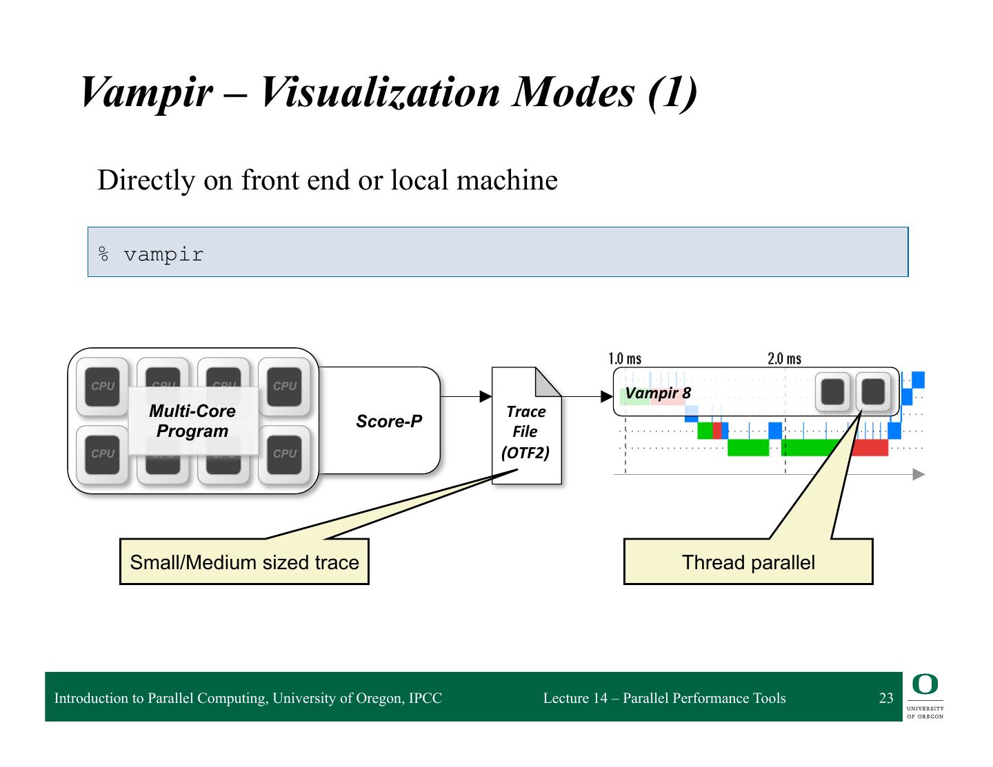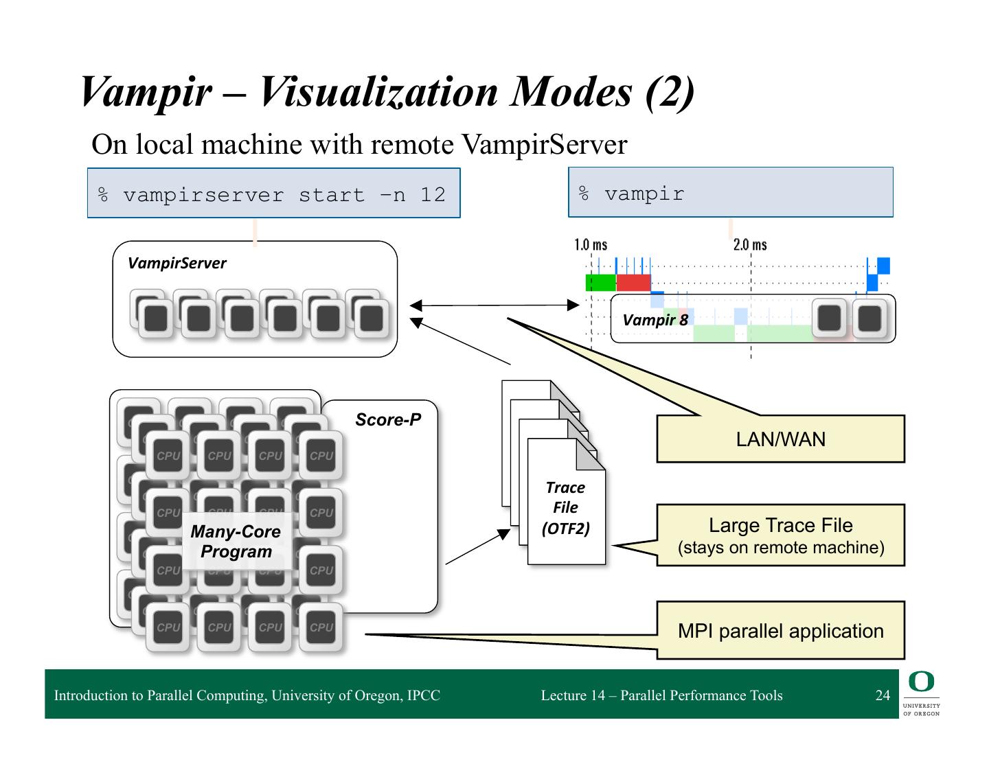 23 . Vampir – Visualization Modes (1) Directly on front end or local machine % vampir CPU CPU CPU CPU Vampir 8 Multi-Core Trace Score-P Program File CPU CPU CPU CPU (OTF2) Small/Medium sized trace Thread parallel Introduction to Parallel Computing, University of Oregon, IPCC Lecture 14 – Parallel Performance Tools 23