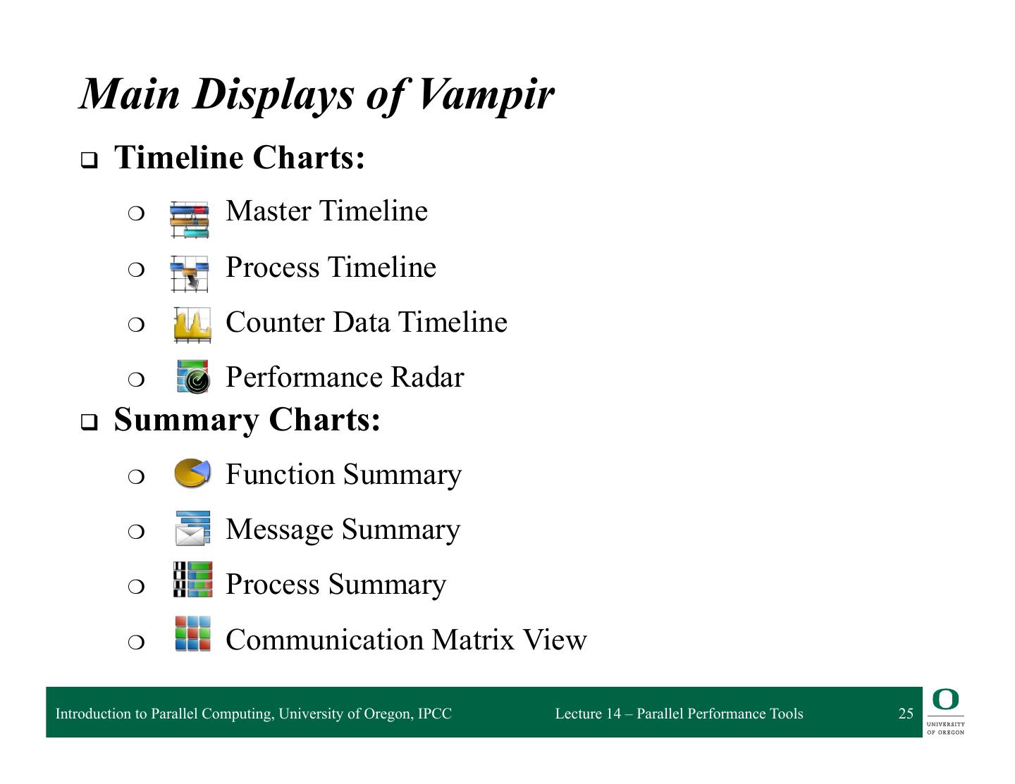 25 . Main Displays of Vampir q Timeline Charts: ❍ Master Timeline ❍ Process Timeline ❍ Counter Data Timeline ❍ Performance Radar q Summary Charts: ❍ Function Summary ❍ Message Summary ❍ Process Summary ❍ Communication Matrix View Introduction to Parallel Computing, University of Oregon, IPCC Lecture 14 – Parallel Performance Tools 25
