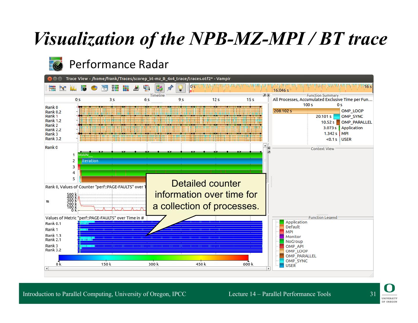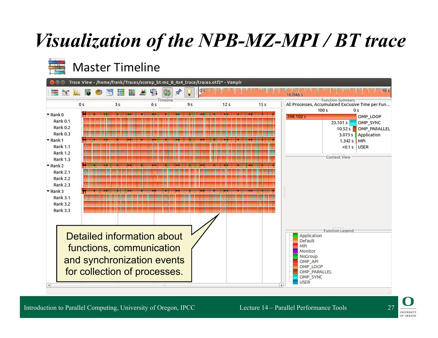 26 . Visualization of the NPB-MZ-MPI / BT trace % vampir scorep_bt-mz_B_4x4_trace Navigation Toolbar Function Summary Function Legend Master Timeline Introduction to Parallel Computing, University of Oregon, IPCC Lecture 14 – Parallel Performance Tools 26