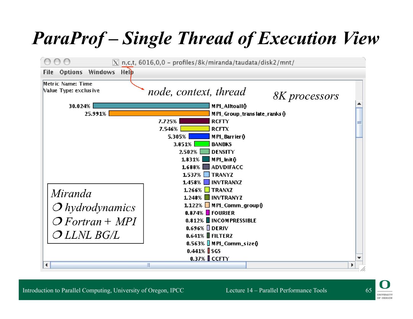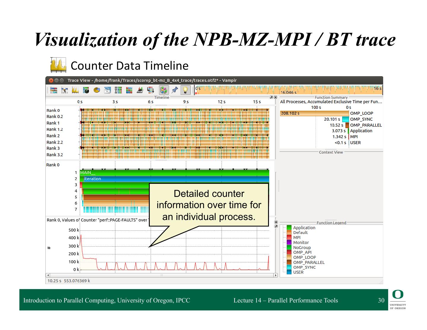 28 . Visualization of the NPB-MZ-MPI / BT trace Process Timeline Detailed information about different levels of function calls in a stacked bar chart for an individual process. Introduction to Parallel Computing, University of Oregon, IPCC Lecture 14 – Parallel Performance Tools 28