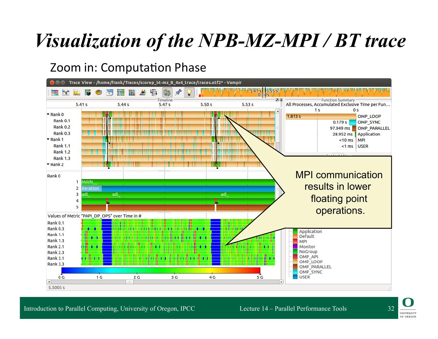 29 . Visualization of the NPB-MZ-MPI / BT trace Typical program phases Initialisation Phase Computation Phase Introduction to Parallel Computing, University of Oregon, IPCC Lecture 14 – Parallel Performance Tools 29