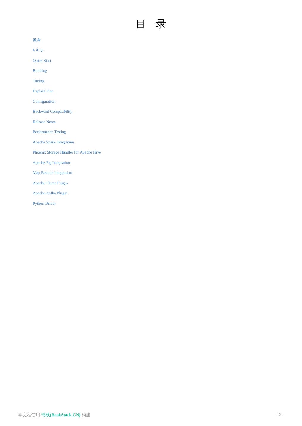 2 . 目 录 致谢 F.A.Q. Quick Start Building Tuning Explain Plan Configuration Backward Compatibility Release Notes Performance Testing Apache Spark Integration Phoenix Storage Handler for Apache Hive Apache Pig Integration Map Reduce Integration Apache Flume Plugin Apache Kafka Plugin Python Driver 本文档使用 书栈(BookStack.CN) 构建 - 2 -