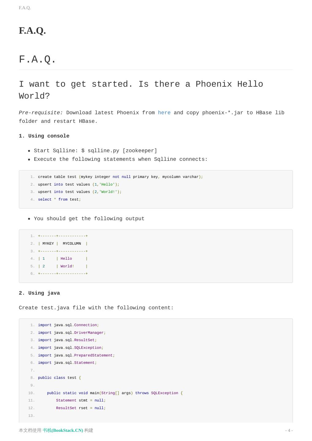 4 .F.A.Q. F.A.Q. F.A.Q. I want to get started. Is there a Phoenix Hello World? Pre-requisite: Download latest Phoenix from here and copy phoenix-*.jar to HBase lib folder and restart HBase. 1. Using console Start Sqlline: $ sqlline.py [zookeeper] Execute the following statements when Sqlline connects: 1. create table test (mykey integer not null primary key, mycolumn varchar); 2. upsert into test values (1,'Hello'); 3. upsert into test values (2,'World!'); 4. select * from test; You should get the following output 1. +-------+------------+ 2. | MYKEY | MYCOLUMN | 3. +-------+------------+ 4. | 1 | Hello | 5. | 2 | World! | 6. +-------+------------+ 2. Using java Create test.java file with the following content: 1. import java.sql.Connection; 2. import java.sql.DriverManager; 3. import java.sql.ResultSet; 4. import java.sql.SQLException; 5. import java.sql.PreparedStatement; 6. import java.sql.Statement; 7. 8. public class test { 9. 10. public static void main(String[] args) throws SQLException { 11. Statement stmt = null; 12. ResultSet rset = null; 13. 本文档使用 书栈(BookStack.CN) 构建 - 4 -