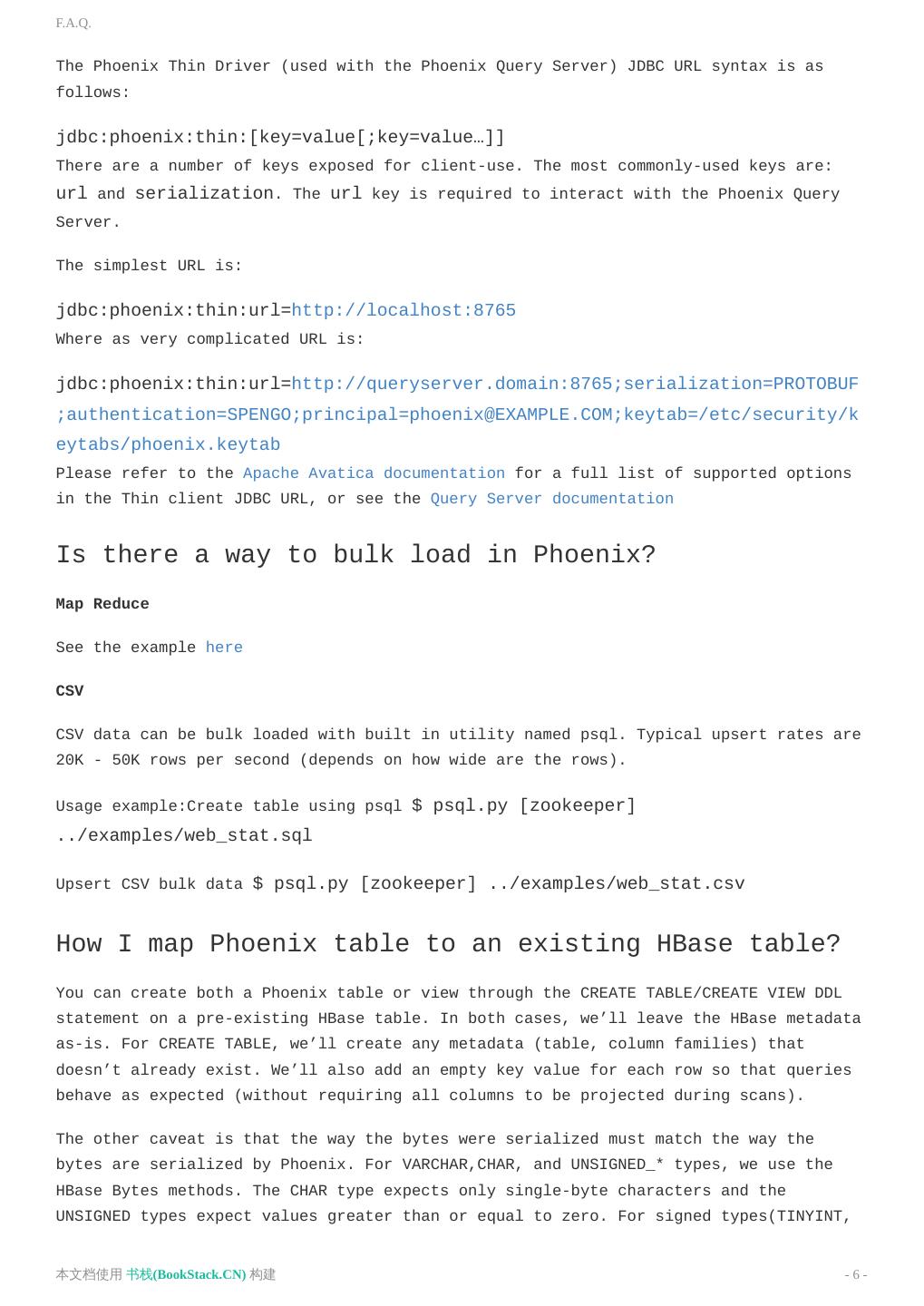 6 .F.A.Q. The Phoenix Thin Driver (used with the Phoenix Query Server) JDBC URL syntax is as follows: jdbc:phoenix:thin:[key=value[;key=value…]] There are a number of keys exposed for client-use. The most commonly-used keys are: url and serialization. The url key is required to interact with the Phoenix Query Server. The simplest URL is: jdbc:phoenix:thin:url=http://localhost:8765 Where as very complicated URL is: jdbc:phoenix:thin:url=http://queryserver.domain:8765;serialization=PROTOBUF ;authentication=SPENGO;principal=phoenix@EXAMPLE.COM;keytab=/etc/security/k eytabs/phoenix.keytab Please refer to the Apache Avatica documentation for a full list of supported options in the Thin client JDBC URL, or see the Query Server documentation Is there a way to bulk load in Phoenix? Map Reduce See the example here CSV CSV data can be bulk loaded with built in utility named psql. Typical upsert rates are 20K - 50K rows per second (depends on how wide are the rows). Usage example:Create table using psql $ psql.py [zookeeper] ../examples/web_stat.sql Upsert CSV bulk data $ psql.py [zookeeper] ../examples/web_stat.csv How I map Phoenix table to an existing HBase table? You can create both a Phoenix table or view through the CREATE TABLE/CREATE VIEW DDL statement on a pre-existing HBase table. In both cases, we’ll leave the HBase metadata as-is. For CREATE TABLE, we’ll create any metadata (table, column families) that doesn’t already exist. We’ll also add an empty key value for each row so that queries behave as expected (without requiring all columns to be projected during scans). The other caveat is that the way the bytes were serialized must match the way the bytes are serialized by Phoenix. For VARCHAR,CHAR, and UNSIGNED_* types, we use the HBase Bytes methods. The CHAR type expects only single-byte characters and the UNSIGNED types expect values greater than or equal to zero. For signed types(TINYINT, 本文档使用 书栈(BookStack.CN) 构建 - 6 -