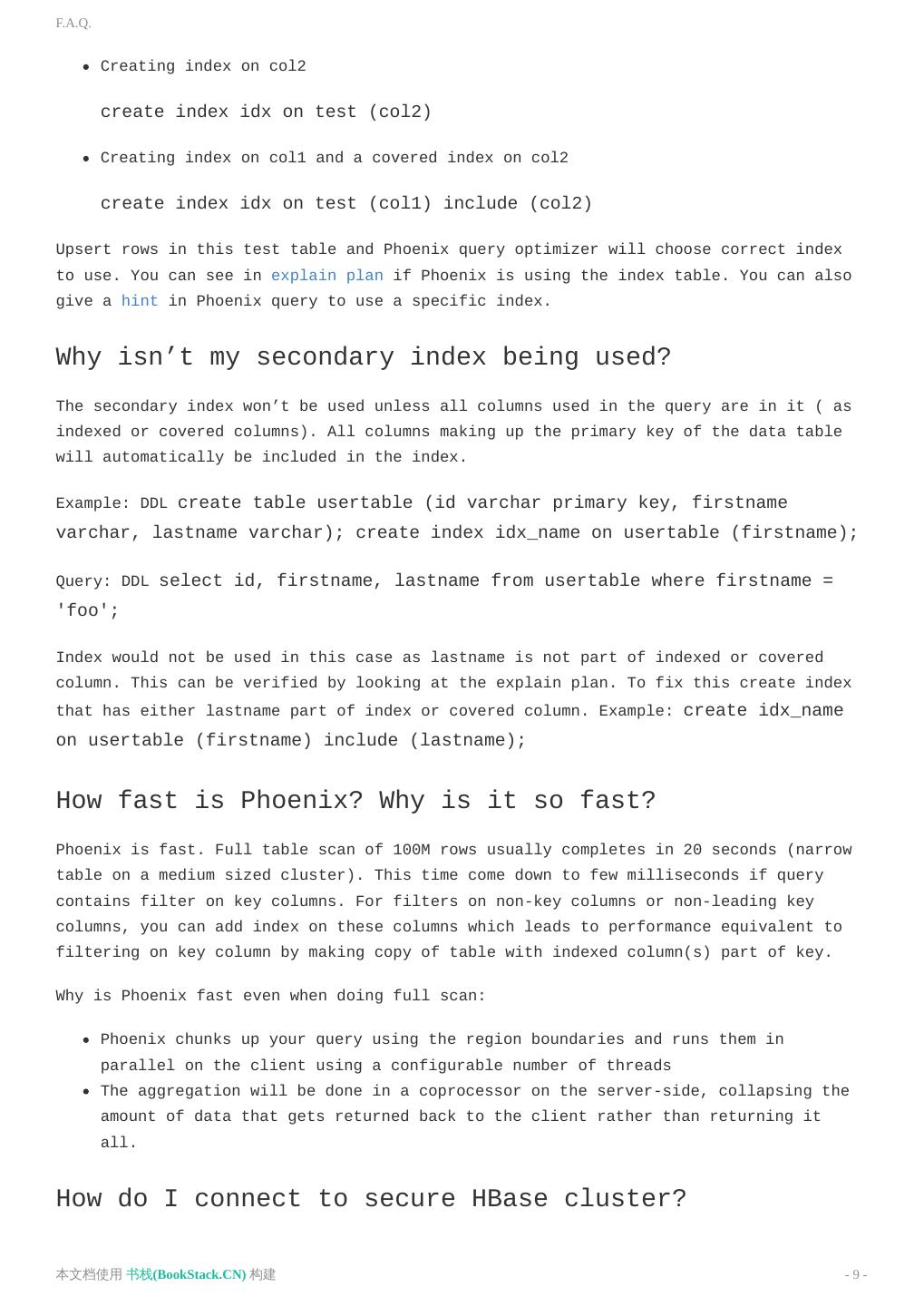 9 .F.A.Q. Creating index on col2 create index idx on test (col2) Creating index on col1 and a covered index on col2 create index idx on test (col1) include (col2) Upsert rows in this test table and Phoenix query optimizer will choose correct index to use. You can see in explain plan if Phoenix is using the index table. You can also give a hint in Phoenix query to use a specific index. Why isn’t my secondary index being used? The secondary index won’t be used unless all columns used in the query are in it ( as indexed or covered columns). All columns making up the primary key of the data table will automatically be included in the index. Example: DDL create table usertable (id varchar primary key, firstname varchar, lastname varchar); create index idx_name on usertable (firstname); Query: DDL select id, firstname, lastname from usertable where firstname = 'foo'; Index would not be used in this case as lastname is not part of indexed or covered column. This can be verified by looking at the explain plan. To fix this create index that has either lastname part of index or covered column. Example: create idx_name on usertable (firstname) include (lastname); How fast is Phoenix? Why is it so fast? Phoenix is fast. Full table scan of 100M rows usually completes in 20 seconds (narrow table on a medium sized cluster). This time come down to few milliseconds if query contains filter on key columns. For filters on non-key columns or non-leading key columns, you can add index on these columns which leads to performance equivalent to filtering on key column by making copy of table with indexed column(s) part of key. Why is Phoenix fast even when doing full scan: Phoenix chunks up your query using the region boundaries and runs them in parallel on the client using a configurable number of threads The aggregation will be done in a coprocessor on the server-side, collapsing the amount of data that gets returned back to the client rather than returning it all. How do I connect to secure HBase cluster? 本文档使用 书栈(BookStack.CN) 构建 - 9 -