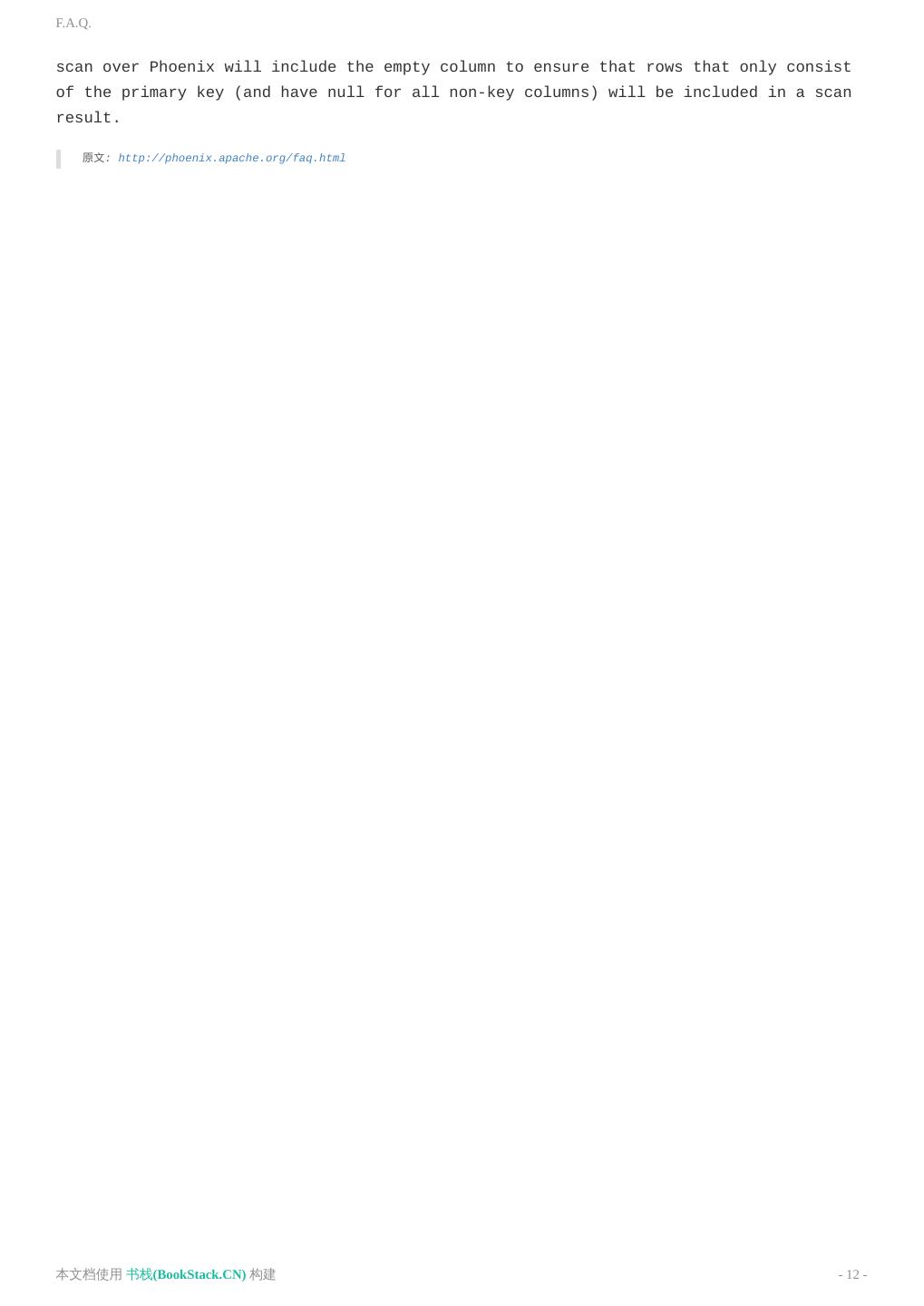 12 .F.A.Q. scan over Phoenix will include the empty column to ensure that rows that only consist of the primary key (and have null for all non-key columns) will be included in a scan result. 原文: http://phoenix.apache.org/faq.html 本文档使用 书栈(BookStack.CN) 构建 - 12 -
