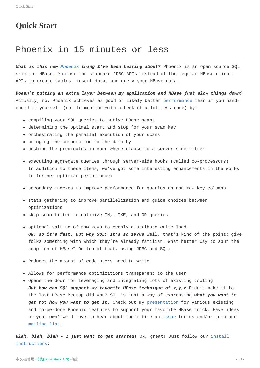 13 .Quick Start Quick Start Phoenix in 15 minutes or less What is this new Phoenix thing I’ve been hearing about? Phoenix is an open source SQL skin for HBase. You use the standard JDBC APIs instead of the regular HBase client APIs to create tables, insert data, and query your HBase data. Doesn’t putting an extra layer between my application and HBase just slow things down? Actually, no. Phoenix achieves as good or likely better performance than if you hand- coded it yourself (not to mention with a heck of a lot less code) by: compiling your SQL queries to native HBase scans determining the optimal start and stop for your scan key orchestrating the parallel execution of your scans bringing the computation to the data by pushing the predicates in your where clause to a server-side filter executing aggregate queries through server-side hooks (called co-processors) In addition to these items, we’ve got some interesting enhancements in the works to further optimize performance: secondary indexes to improve performance for queries on non row key columns stats gathering to improve parallelization and guide choices between optimizations skip scan filter to optimize IN, LIKE, and OR queries optional salting of row keys to evenly distribute write load Ok, so it’s fast. But why SQL? It’s so 1970s Well, that’s kind of the point: give folks something with which they’re already familiar. What better way to spur the adoption of HBase? On top of that, using JDBC and SQL: Reduces the amount of code users need to write Allows for performance optimizations transparent to the user Opens the door for leveraging and integrating lots of existing tooling But how can SQL support my favorite HBase technique of x,y,z Didn’t make it to the last HBase Meetup did you? SQL is just a way of expressing what you want to get not how you want to get it. Check out my presentation for various existing and to-be-done Phoenix features to support your favorite HBase trick. Have ideas of your own? We’d love to hear about them: file an issue for us and/or join our mailing list. Blah, blah, blah - I just want to get started! Ok, great! Just follow our install instructions: 本文档使用 书栈(BookStack.CN) 构建 - 13 -
