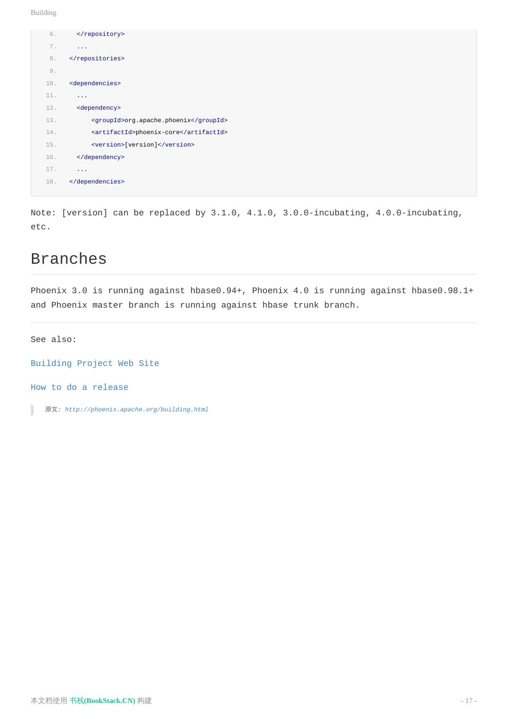 17 .Building 6. </repository> 7. ... 8. </repositories> 9. 10. <dependencies> 11. ... 12. <dependency> 13. <groupId>org.apache.phoenix</groupId> 14. <artifactId>phoenix-core</artifactId> 15. <version>[version]</version> 16. </dependency> 17. ... 18. </dependencies> Note: [version] can be replaced by 3.1.0, 4.1.0, 3.0.0-incubating, 4.0.0-incubating, etc. Branches Phoenix 3.0 is running against hbase0.94+, Phoenix 4.0 is running against hbase0.98.1+ and Phoenix master branch is running against hbase trunk branch. See also: Building Project Web Site How to do a release 原文: http://phoenix.apache.org/building.html 本文档使用 书栈(BookStack.CN) 构建 - 17 -