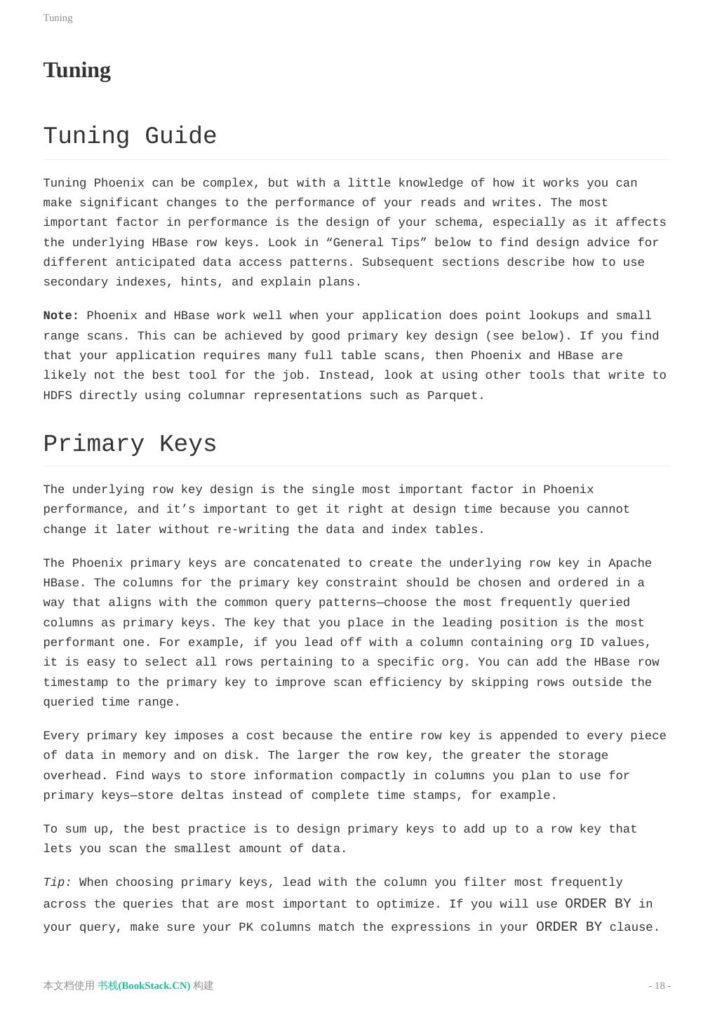 18 .Tuning Tuning Tuning Guide Tuning Phoenix can be complex, but with a little knowledge of how it works you can make significant changes to the performance of your reads and writes. The most important factor in performance is the design of your schema, especially as it affects the underlying HBase row keys. Look in “General Tips” below to find design advice for different anticipated data access patterns. Subsequent sections describe how to use secondary indexes, hints, and explain plans. Note: Phoenix and HBase work well when your application does point lookups and small range scans. This can be achieved by good primary key design (see below). If you find that your application requires many full table scans, then Phoenix and HBase are likely not the best tool for the job. Instead, look at using other tools that write to HDFS directly using columnar representations such as Parquet. Primary Keys The underlying row key design is the single most important factor in Phoenix performance, and it’s important to get it right at design time because you cannot change it later without re-writing the data and index tables. The Phoenix primary keys are concatenated to create the underlying row key in Apache HBase. The columns for the primary key constraint should be chosen and ordered in a way that aligns with the common query patterns—choose the most frequently queried columns as primary keys. The key that you place in the leading position is the most performant one. For example, if you lead off with a column containing org ID values, it is easy to select all rows pertaining to a specific org. You can add the HBase row timestamp to the primary key to improve scan efficiency by skipping rows outside the queried time range. Every primary key imposes a cost because the entire row key is appended to every piece of data in memory and on disk. The larger the row key, the greater the storage overhead. Find ways to store information compactly in columns you plan to use for primary keys—store deltas instead of complete time stamps, for example. To sum up, the best practice is to design primary keys to add up to a row key that lets you scan the smallest amount of data. Tip: When choosing primary keys, lead with the column you filter most frequently across the queries that are most important to optimize. If you will use ORDER BY in your query, make sure your PK columns match the expressions in your ORDER BY clause. 本文档使用 书栈(BookStack.CN) 构建 - 18 -