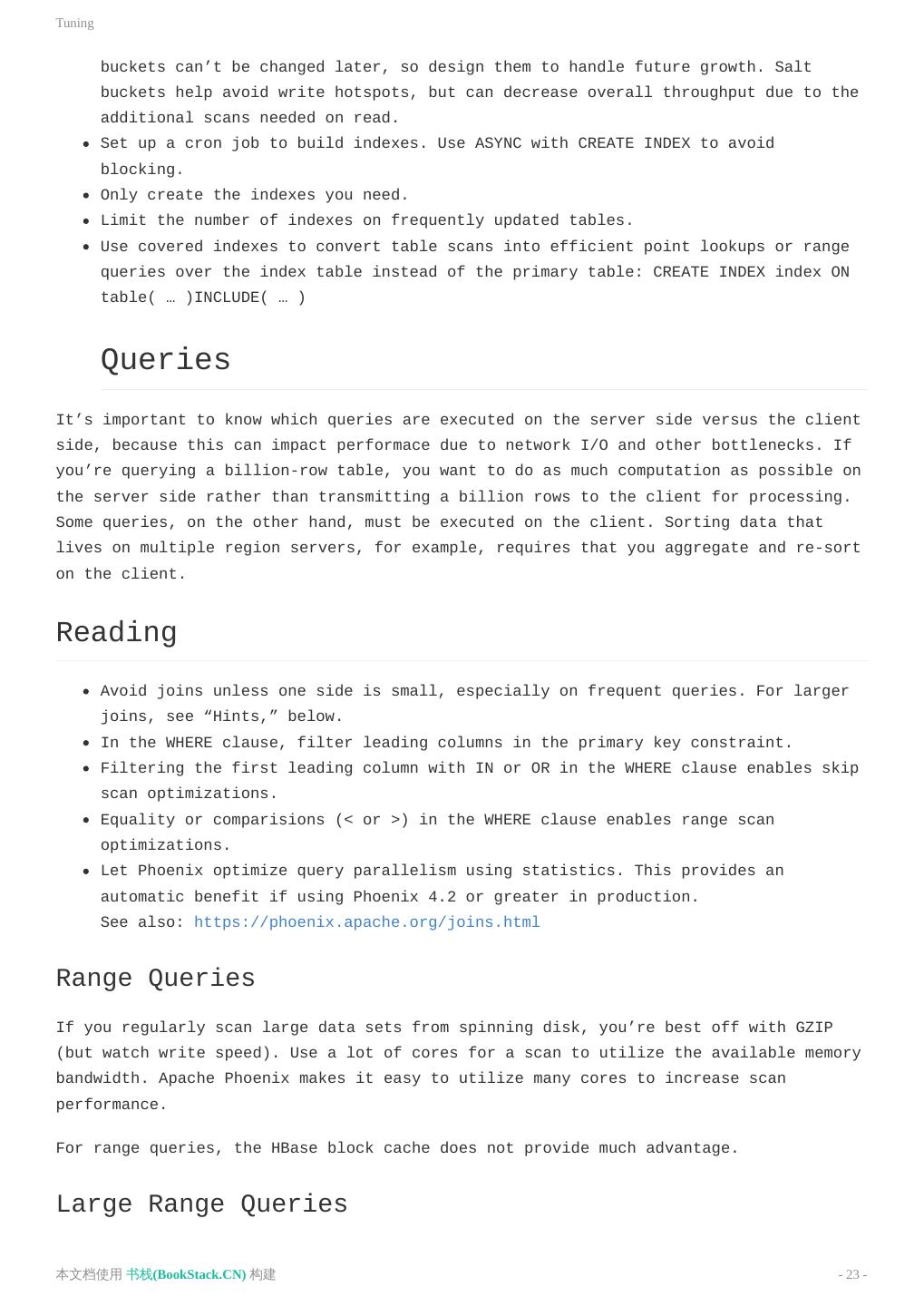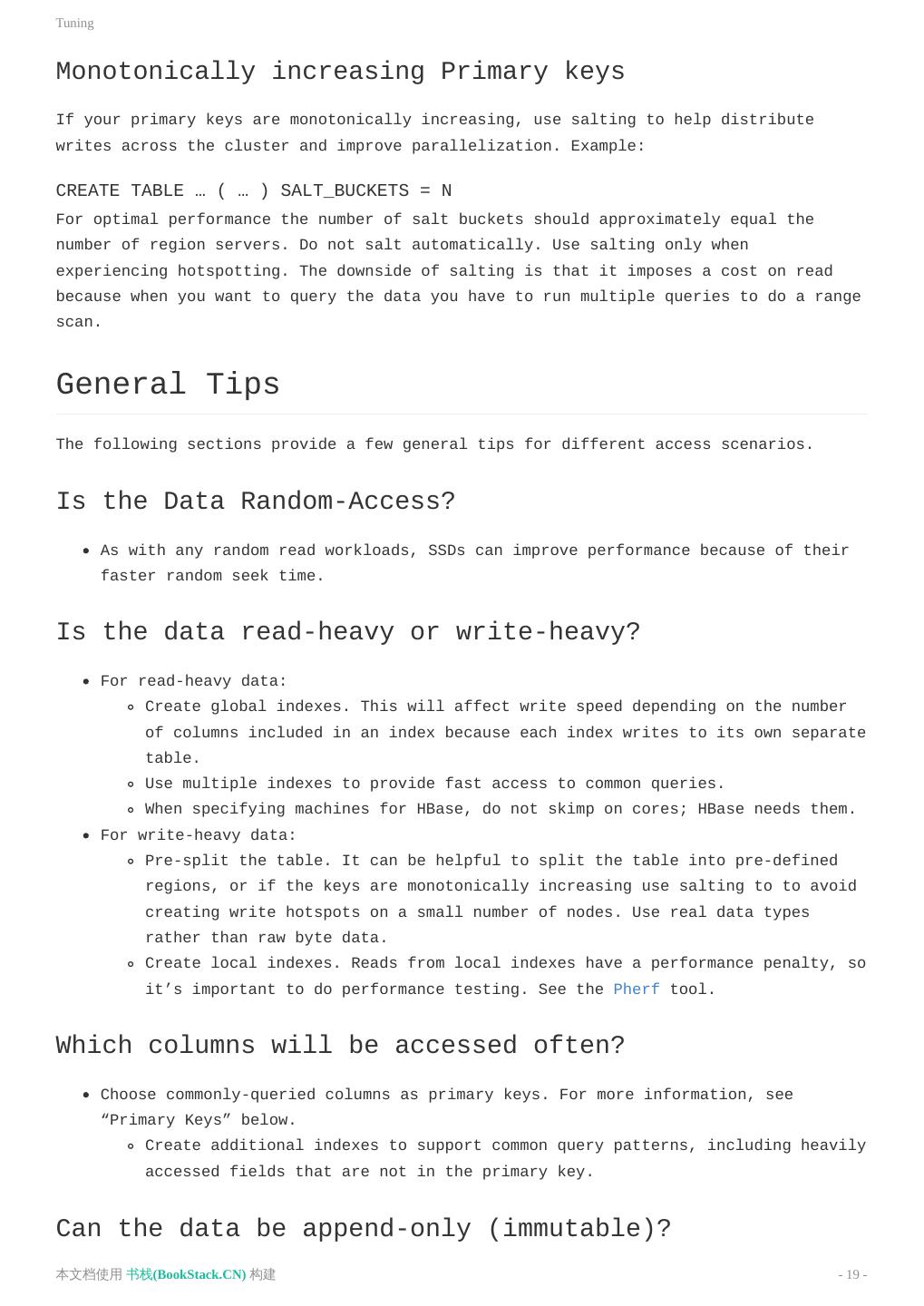 19 .Tuning Monotonically increasing Primary keys If your primary keys are monotonically increasing, use salting to help distribute writes across the cluster and improve parallelization. Example: CREATE TABLE … ( … ) SALT_BUCKETS = N For optimal performance the number of salt buckets should approximately equal the number of region servers. Do not salt automatically. Use salting only when experiencing hotspotting. The downside of salting is that it imposes a cost on read because when you want to query the data you have to run multiple queries to do a range scan. General Tips The following sections provide a few general tips for different access scenarios. Is the Data Random-Access? As with any random read workloads, SSDs can improve performance because of their faster random seek time. Is the data read-heavy or write-heavy? For read-heavy data: Create global indexes. This will affect write speed depending on the number of columns included in an index because each index writes to its own separate table. Use multiple indexes to provide fast access to common queries. When specifying machines for HBase, do not skimp on cores; HBase needs them. For write-heavy data: Pre-split the table. It can be helpful to split the table into pre-defined regions, or if the keys are monotonically increasing use salting to to avoid creating write hotspots on a small number of nodes. Use real data types rather than raw byte data. Create local indexes. Reads from local indexes have a performance penalty, so it’s important to do performance testing. See the Pherf tool. Which columns will be accessed often? Choose commonly-queried columns as primary keys. For more information, see “Primary Keys” below. Create additional indexes to support common query patterns, including heavily accessed fields that are not in the primary key. Can the data be append-only (immutable)? 本文档使用 书栈(BookStack.CN) 构建 - 19 -