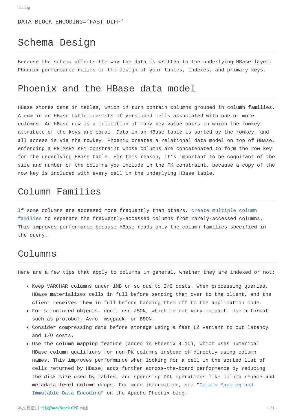 21 .Tuning DATA_BLOCK_ENCODING=‘FAST_DIFF’ Schema Design Because the schema affects the way the data is written to the underlying HBase layer, Phoenix performance relies on the design of your tables, indexes, and primary keys. Phoenix and the HBase data model HBase stores data in tables, which in turn contain columns grouped in column families. A row in an HBase table consists of versioned cells associated with one or more columns. An HBase row is a collection of many key-value pairs in which the rowkey attribute of the keys are equal. Data in an HBase table is sorted by the rowkey, and all access is via the rowkey. Phoenix creates a relational data model on top of HBase, enforcing a PRIMARY KEY constraint whose columns are concatenated to form the row key for the underlying HBase table. For this reason, it’s important to be cognizant of the size and number of the columns you include in the PK constraint, because a copy of the row key is included with every cell in the underlying HBase table. Column Families If some columns are accessed more frequently than others, create multiple column families to separate the frequently-accessed columns from rarely-accessed columns. This improves performance because HBase reads only the column families specified in the query. Columns Here are a few tips that apply to columns in general, whether they are indexed or not: Keep VARCHAR columns under 1MB or so due to I/O costs. When processing queries, HBase materializes cells in full before sending them over to the client, and the client receives them in full before handing them off to the application code. For structured objects, don’t use JSON, which is not very compact. Use a format such as protobuf, Avro, msgpack, or BSON. Consider compressing data before storage using a fast LZ variant to cut latency and I/O costs. Use the column mapping feature (added in Phoenix 4.10), which uses numerical HBase column qualifiers for non-PK columns instead of directly using column names. This improves performance when looking for a cell in the sorted list of cells returned by HBase, adds further across-the-board performance by reducing the disk size used by tables, and speeds up DDL operations like column rename and metadata-level column drops. For more information, see “Column Mapping and Immutable Data Encoding” on the Apache Phoenix blog. 本文档使用 书栈(BookStack.CN) 构建 - 21 -