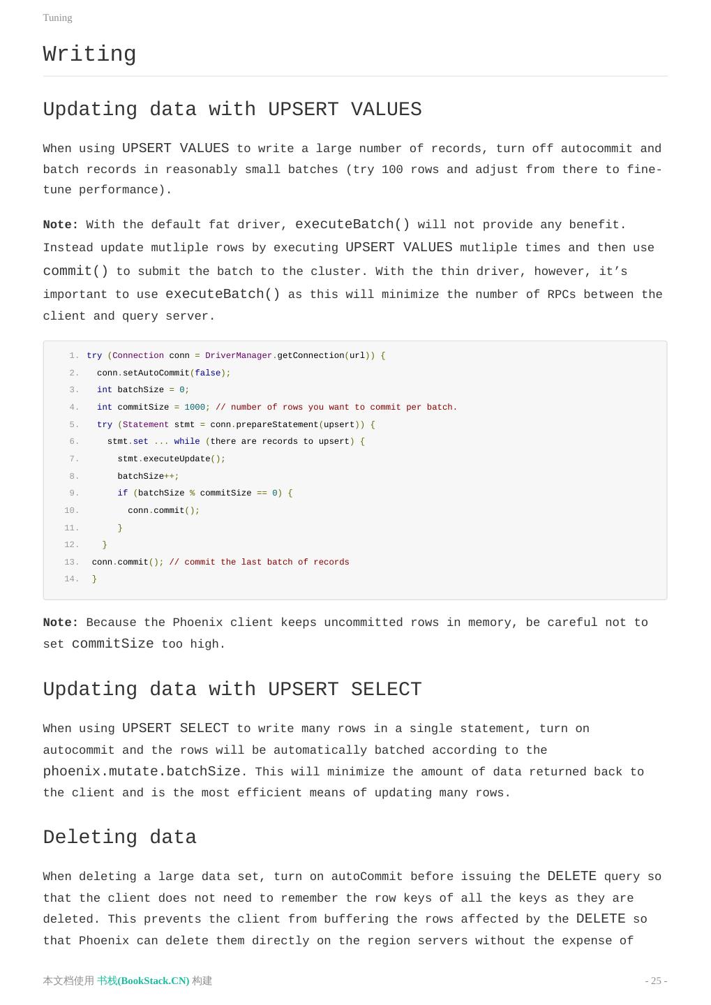 25 .Tuning Writing Updating data with UPSERT VALUES When using UPSERT VALUES to write a large number of records, turn off autocommit and batch records in reasonably small batches (try 100 rows and adjust from there to fine- tune performance). Note: With the default fat driver, executeBatch() will not provide any benefit. Instead update mutliple rows by executing UPSERT VALUES mutliple times and then use commit() to submit the batch to the cluster. With the thin driver, however, it’s important to use executeBatch() as this will minimize the number of RPCs between the client and query server. 1. try (Connection conn = DriverManager.getConnection(url)) { 2. conn.setAutoCommit(false); 3. int batchSize = 0; 4. int commitSize = 1000; // number of rows you want to commit per batch. 5. try (Statement stmt = conn.prepareStatement(upsert)) { 6. stmt.set ... while (there are records to upsert) { 7. stmt.executeUpdate(); 8. batchSize++; 9. if (batchSize % commitSize == 0) { 10. conn.commit(); 11. } 12. } 13. conn.commit(); // commit the last batch of records 14. } Note: Because the Phoenix client keeps uncommitted rows in memory, be careful not to set commitSize too high. Updating data with UPSERT SELECT When using UPSERT SELECT to write many rows in a single statement, turn on autocommit and the rows will be automatically batched according to the phoenix.mutate.batchSize. This will minimize the amount of data returned back to the client and is the most efficient means of updating many rows. Deleting data When deleting a large data set, turn on autoCommit before issuing the DELETE query so that the client does not need to remember the row keys of all the keys as they are deleted. This prevents the client from buffering the rows affected by the DELETE so that Phoenix can delete them directly on the region servers without the expense of 本文档使用 书栈(BookStack.CN) 构建 - 25 -