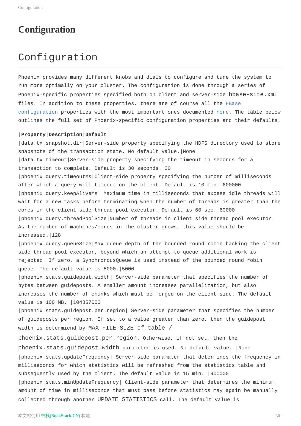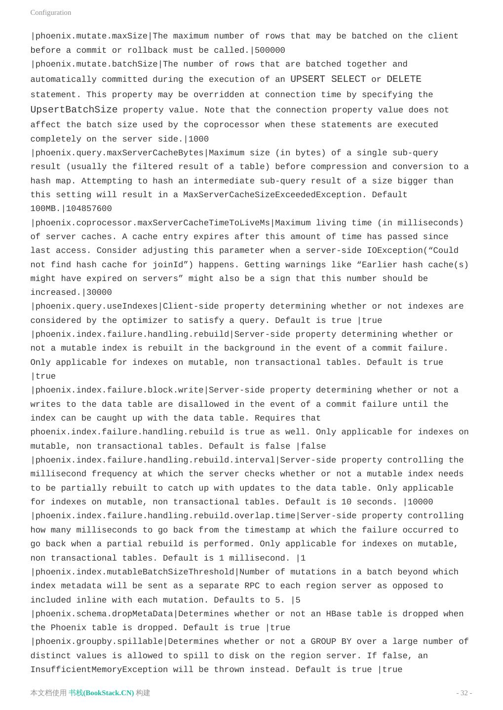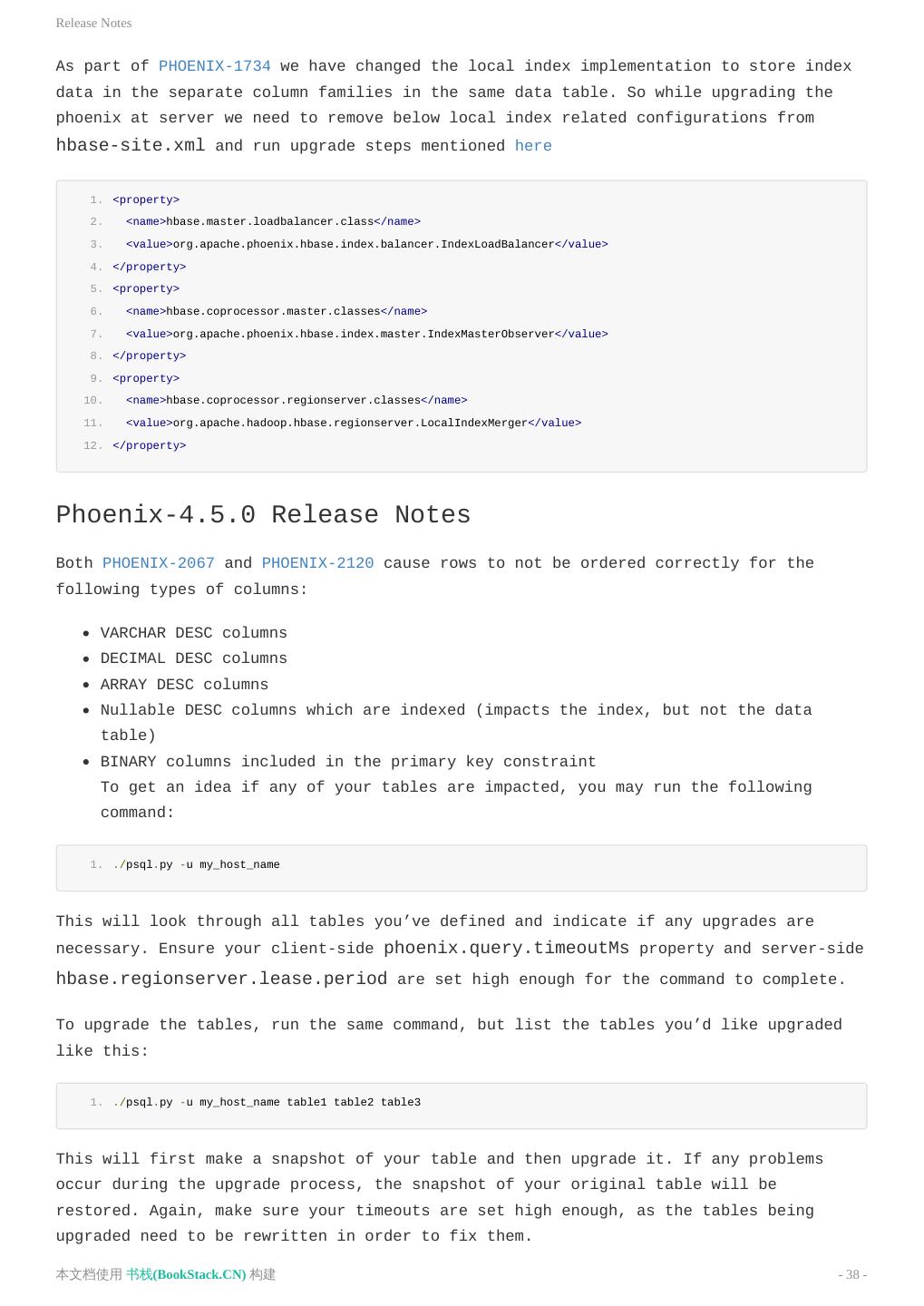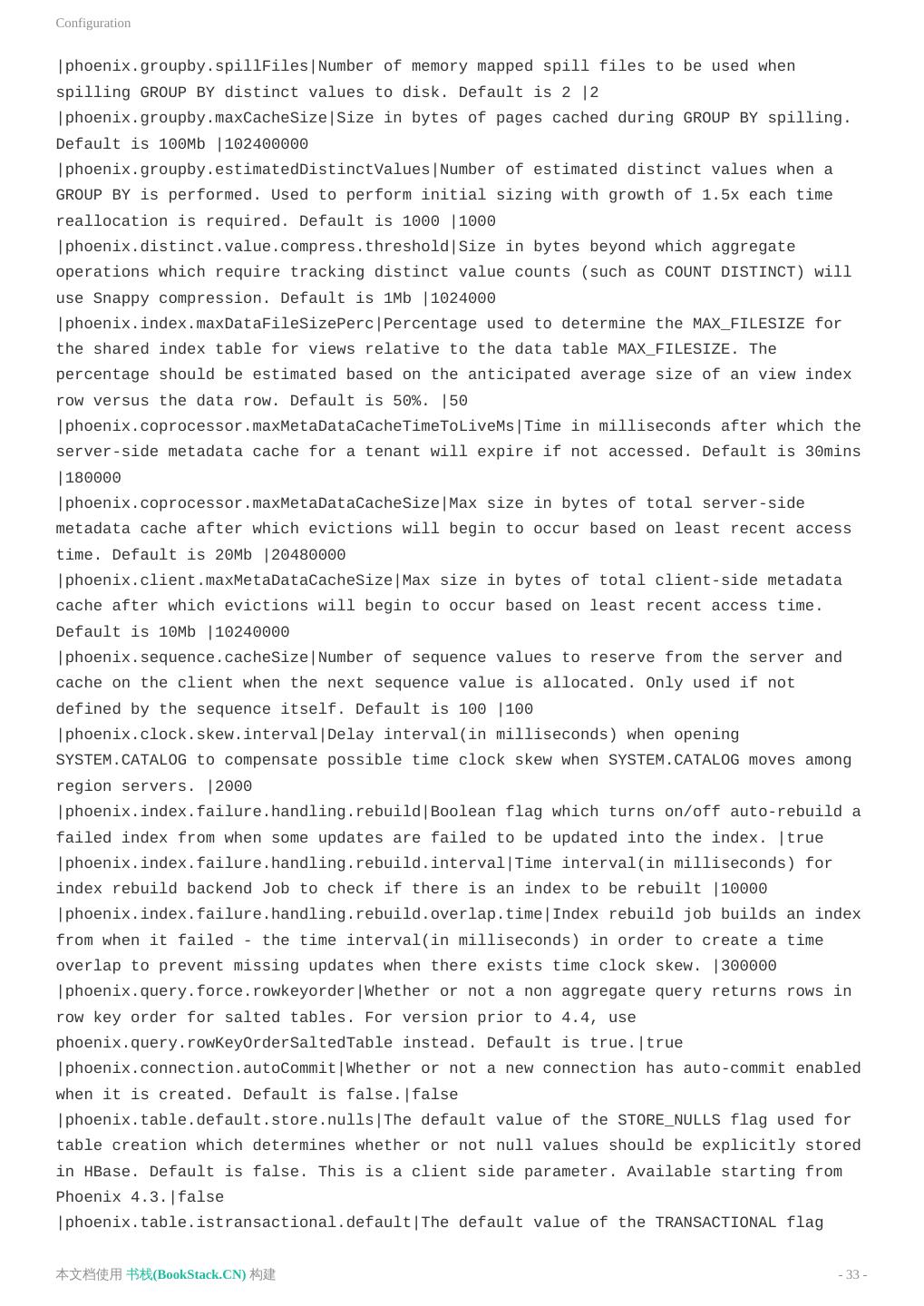 3 .致谢 致谢 当前文档 《Apache Phoenix使用文档(英文)》 由 进击的皇虫 使用 书栈(BookStack.CN) 进行构建,生 成于 2018-07-15。 书栈(BookStack.CN) 仅提供文档编写、整理、归类等功能,以及对文档内容的生成和导出工具。 文档内容由网友们编写和整理,书栈(BookStack.CN) 难以确认文档内容知识点是否错漏。如果您在阅读文档 获取知识的时候,发现文档内容有不恰当的地方,请向我们反馈,让我们共同携手,将知识准确、高效且有效地传递 给每一个人。 同时,如果您在日常工作、生活和学习中遇到有价值有营养的知识文档,欢迎分享到 书栈(BookStack.CN) , 为知识的传承献上您的一份力量! 如果当前文档生成时间太久,请到 书栈(BookStack.CN) 获取最新的文档,以跟上知识更新换代的步伐。 文档地址:http://www.bookstack.cn/books/Apache-Phoenix-en 书栈官网:http://www.bookstack.cn 书栈开源:https://github.com/TruthHun 分享,让知识传承更久远! 感谢知识的创造者,感谢知识的分享者,也感谢每一位阅读到此处的读者,因为我们 都将成为知识的传承者。 本文档使用 书栈(BookStack.CN) 构建 - 3 -