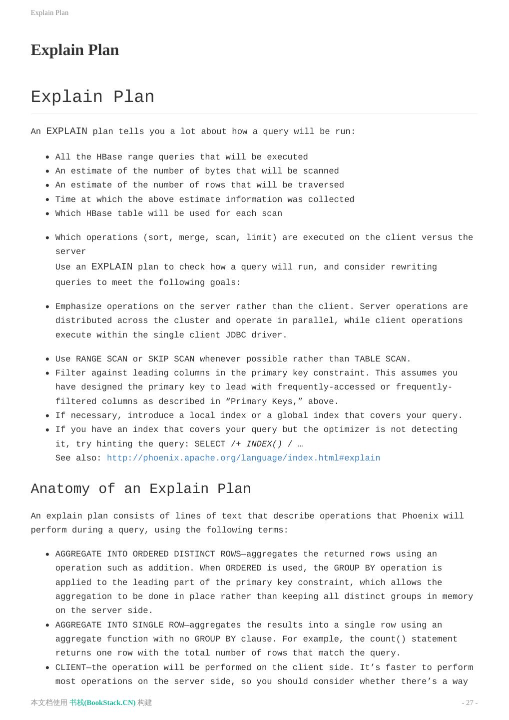 27 .Explain Plan Explain Plan Explain Plan An EXPLAIN plan tells you a lot about how a query will be run: All the HBase range queries that will be executed An estimate of the number of bytes that will be scanned An estimate of the number of rows that will be traversed Time at which the above estimate information was collected Which HBase table will be used for each scan Which operations (sort, merge, scan, limit) are executed on the client versus the server Use an EXPLAIN plan to check how a query will run, and consider rewriting queries to meet the following goals: Emphasize operations on the server rather than the client. Server operations are distributed across the cluster and operate in parallel, while client operations execute within the single client JDBC driver. Use RANGE SCAN or SKIP SCAN whenever possible rather than TABLE SCAN. Filter against leading columns in the primary key constraint. This assumes you have designed the primary key to lead with frequently-accessed or frequently- filtered columns as described in “Primary Keys,” above. If necessary, introduce a local index or a global index that covers your query. If you have an index that covers your query but the optimizer is not detecting it, try hinting the query: SELECT /+ INDEX() / … See also: http://phoenix.apache.org/language/index.html#explain Anatomy of an Explain Plan An explain plan consists of lines of text that describe operations that Phoenix will perform during a query, using the following terms: AGGREGATE INTO ORDERED DISTINCT ROWS—aggregates the returned rows using an operation such as addition. When ORDERED is used, the GROUP BY operation is applied to the leading part of the primary key constraint, which allows the aggregation to be done in place rather than keeping all distinct groups in memory on the server side. AGGREGATE INTO SINGLE ROW—aggregates the results into a single row using an aggregate function with no GROUP BY clause. For example, the count() statement returns one row with the total number of rows that match the query. CLIENT—the operation will be performed on the client side. It’s faster to perform most operations on the server side, so you should consider whether there’s a way 本文档使用 书栈(BookStack.CN) 构建 - 27 -