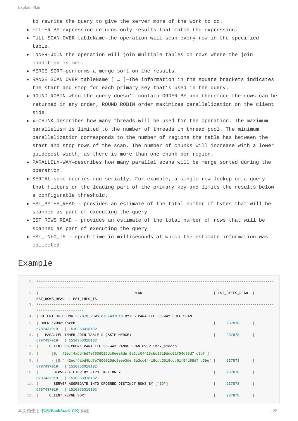 28 .Explain Plan to rewrite the query to give the server more of the work to do. FILTER BY expression—returns only results that match the expression. FULL SCAN OVER tableName—the operation will scan every row in the specified table. INNER-JOIN—the operation will join multiple tables on rows where the join condition is met. MERGE SORT—performs a merge sort on the results. RANGE SCAN OVER tableName [ … ]—The information in the square brackets indicates the start and stop for each primary key that’s used in the query. ROUND ROBIN—when the query doesn’t contain ORDER BY and therefore the rows can be returned in any order, ROUND ROBIN order maximizes parallelization on the client side. x-CHUNK—describes how many threads will be used for the operation. The maximum parallelism is limited to the number of threads in thread pool. The minimum parallelization corresponds to the number of regions the table has between the start and stop rows of the scan. The number of chunks will increase with a lower guidepost width, as there is more than one chunk per region. PARALLELx-WAY—describes how many parallel scans will be merge sorted during the operation. SERIAL—some queries run serially. For example, a single row lookup or a query that filters on the leading part of the primary key and limits the results below a configurable threshold. EST_BYTES_READ - provides an estimate of the total number of bytes that will be scanned as part of executing the query EST_ROWS_READ - provides an estimate of the total number of rows that will be scanned as part of executing the query EST_INFO_TS - epoch time in milliseconds at which the estimate information was collected Example 1. +------------------------------------------------------------------------------------------------------------- ---------------------- 2. | PLAN | EST_BYTES_READ | EST_ROWS_READ | EST_INFO_TS | 3. +------------------------------------------------------------------------------------------------------------- ---------------------- 4. | CLIENT 36-CHUNK 237878 ROWS 6787437019 BYTES PARALLEL 36-WAY FULL SCAN 5. | OVER exDocStoreb | 237878 | 6787437019 | 1510353318102| 6. | PARALLEL INNER-JOIN TABLE 0 (SKIP MERGE) | 237878 | 6787437019 | 1510353318102| 7. | CLIENT 36-CHUNK PARALLEL 36-WAY RANGE SCAN OVER indx_exdocb 8. | [0,' 42ecf4abd4bd7e7606025dc8eee3de 6a3cc04418cbc2619ddc01f54d88d7 c3bf'] 9. | - [0,' 42ecf4abd4bd7e7606025dc8eee3de 6a3cc04418cbc2619ddc01f54d88d7 c3bg' | 237878 | 6787437019 | 1510353318102| 10. | SERVER FILTER BY FIRST KEY ONLY | 237878 | 6787437019 | 1510353318102| 11. | SERVER AGGREGATE INTO ORDERED DISTINCT ROWS BY ["ID"] | 237878 | 6787437019 | 1510353318102| 12. | CLIENT MERGE SORT | 237878 | 本文档使用 书栈(BookStack.CN) 构建 - 28 -