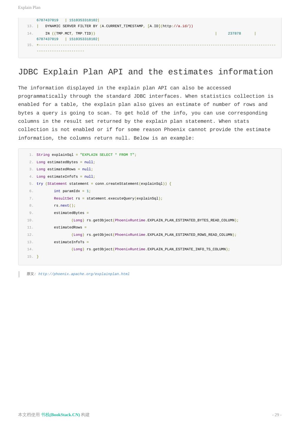 29 .Explain Plan 6787437019 | 1510353318102| 13. | DYNAMIC SERVER FILTER BY (A.CURRENT_TIMESTAMP, [A.ID](http://a.id/)) 14. IN ((TMP.MCT, TMP.TID)) | 237878 | 6787437019 | 1510353318102| 15. +------------------------------------------------------------------------------------------------------------- ---------------------- JDBC Explain Plan API and the estimates information The information displayed in the explain plan API can also be accessed programmatically through the standard JDBC interfaces. When statistics collection is enabled for a table, the explain plan also gives an estimate of number of rows and bytes a query is going to scan. To get hold of the info, you can use corresponding columns in the result set returned by the explain plan statement. When stats collection is not enabled or if for some reason Phoenix cannot provide the estimate information, the columns return null. Below is an example: 1. String explainSql = "EXPLAIN SELECT * FROM T"; 2. Long estimatedBytes = null; 3. Long estimatedRows = null; 4. Long estimateInfoTs = null; 5. try (Statement statement = conn.createStatement(explainSql)) { 6. int paramIdx = 1; 7. ResultSet rs = statement.executeQuery(explainSql); 8. rs.next(); 9. estimatedBytes = 10. (Long) rs.getObject(PhoenixRuntime.EXPLAIN_PLAN_ESTIMATED_BYTES_READ_COLUMN); 11. estimatedRows = 12. (Long) rs.getObject(PhoenixRuntime.EXPLAIN_PLAN_ESTIMATED_ROWS_READ_COLUMN); 13. estimateInfoTs = 14. (Long) rs.getObject(PhoenixRuntime.EXPLAIN_PLAN_ESTIMATE_INFO_TS_COLUMN); 15. } 原文: http://phoenix.apache.org/explainplan.html 本文档使用 书栈(BookStack.CN) 构建 - 29 -