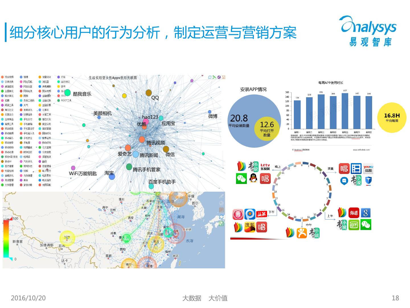 18 .细分核心用户的行为分析,制定运营与营销方案 酷我音乐 QQ 美颜相机 hao123 微博 优酷 应用宝 腾讯视频 爱奇艺 腾讯新闻 微信 腾讯手机管家 WiFi万能钥匙 淘宝 百度手机助手 2016/10/20 大数据 大价值 18