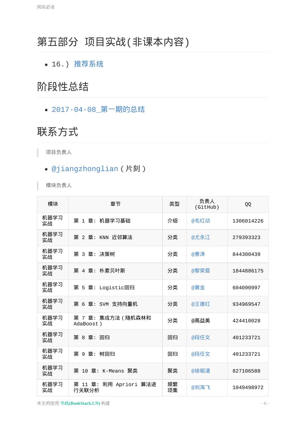 6 .阅前必读 第五部分 项目实战(非课本内容) 16.) 推荐系统 阶段性总结 2017-04-08_第一期的总结 联系方式 项目负责人 @jiangzhonglian(片刻) 模块负责人 负责人 模块 章节 类型 QQ (GitHub) 机器学习 第 1 章: 机器学习基础 介绍 @毛红动 1306014226 实战 机器学习 第 2 章: KNN 近邻算法 分类 @尤永江 279393323 实战 机器学习 第 3 章: 决策树 分类 @景涛 844300439 实战 机器学习 第 4 章: 朴素贝叶斯 分类 @黎荣晋 1844886175 实战 机器学习 第 5 章: Logistic回归 分类 @黄金 604090997 实战 机器学习 第 6 章: SVM 支持向量机 分类 @王德红 934969547 实战 机器学习 第 7 章: 集成方法(随机森林和 分类 @高益美 424410028 实战 AdaBoost) 机器学习 第 8 章: 回归 回归 @段任文 401233721 实战 机器学习 第 9 章: 树回归 回归 @段任文 401233721 实战 机器学习 第 10 章: K-Means 聚类 聚类 @徐昭清 827106588 实战 机器学习 第 11 章: 利用 Apriori 算法进 频繁 @刘海飞 1049498972 实战 行关联分析 项集 本文档使用 书栈(BookStack.CN) 构建 - 6 -