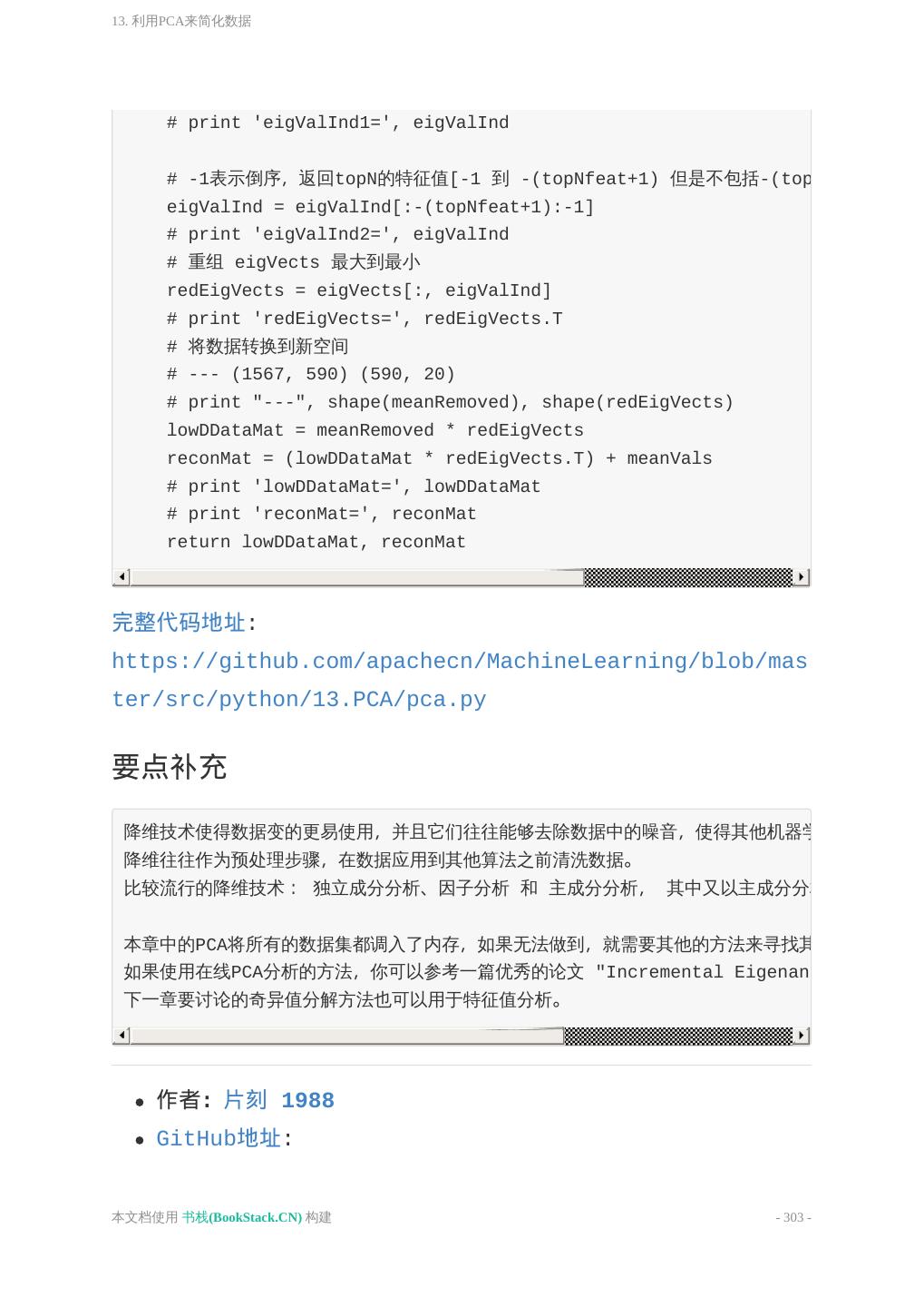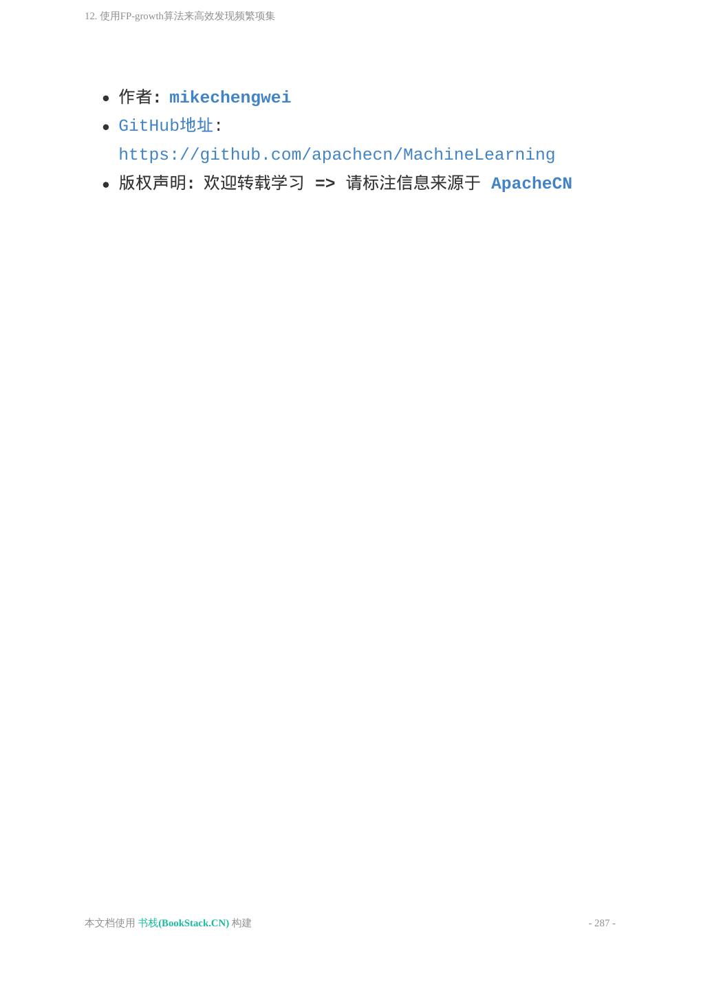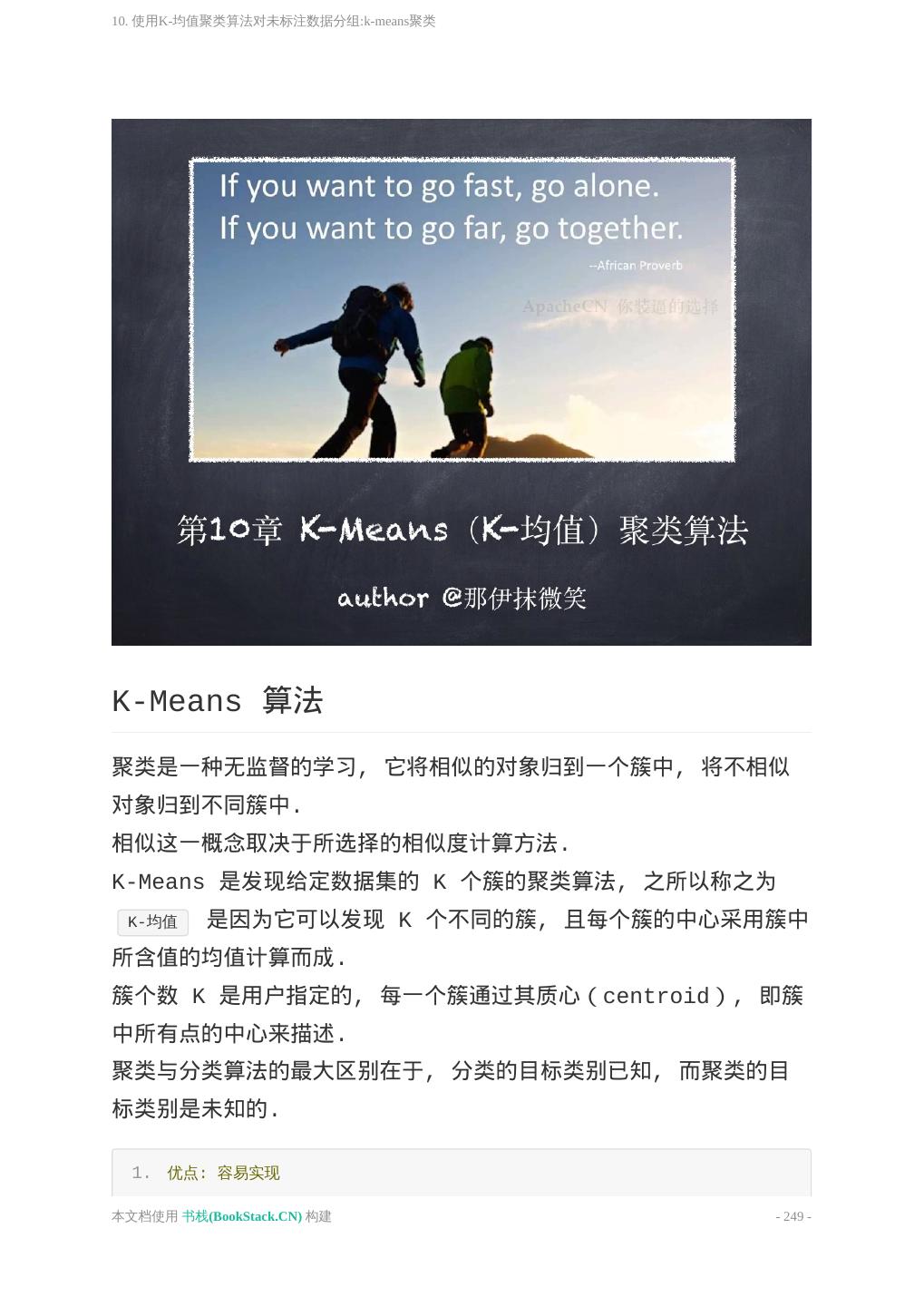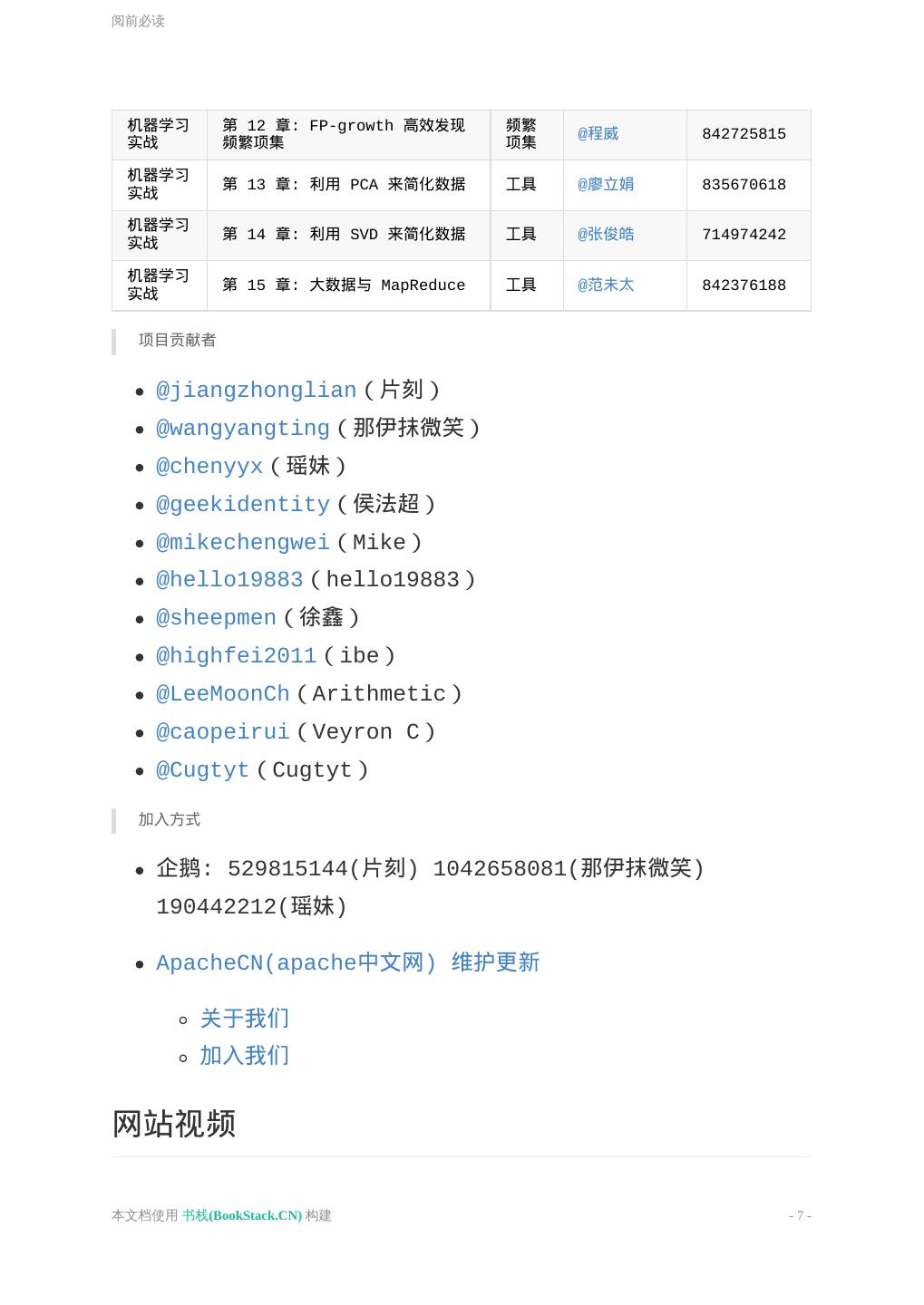 7 .阅前必读 机器学习 第 12 章: FP-growth 高效发现 频繁 @程威 842725815 实战 频繁项集 项集 机器学习 第 13 章: 利用 PCA 来简化数据 工具 @廖立娟 835670618 实战 机器学习 第 14 章: 利用 SVD 来简化数据 工具 @张俊皓 714974242 实战 机器学习 第 15 章: 大数据与 MapReduce 工具 @范未太 842376188 实战 项目贡献者 @jiangzhonglian(片刻) @wangyangting(那伊抹微笑) @chenyyx(瑶妹) @geekidentity(侯法超) @mikechengwei(Mike) @hello19883(hello19883) @sheepmen(徐鑫) @highfei2011(ibe) @LeeMoonCh(Arithmetic) @caopeirui(Veyron C) @Cugtyt(Cugtyt) 加入方式 企鹅: 529815144(片刻) 1042658081(那伊抹微笑) 190442212(瑶妹) ApacheCN(apache中文网) 维护更新 关于我们 加入我们 网站视频 本文档使用 书栈(BookStack.CN) 构建 - 7 -