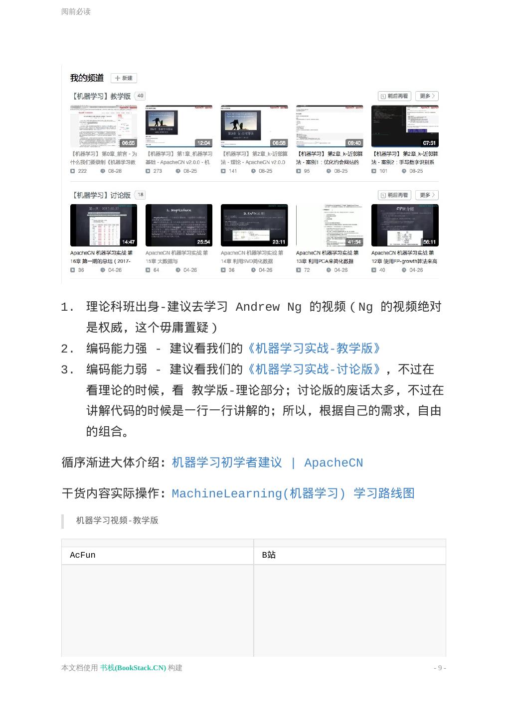 9 .阅前必读 1. 理论科班出身-建议去学习 Andrew Ng 的视频(Ng 的视频绝对 是权威,这个毋庸置疑) 2. 编码能力强 - 建议看我们的《机器学习实战-教学版》 3. 编码能力弱 - 建议看我们的《机器学习实战-讨论版》,不过在 看理论的时候,看 教学版-理论部分;讨论版的废话太多,不过在 讲解代码的时候是一行一行讲解的;所以,根据自己的需求,自由 的组合。 循序渐进大体介绍:机器学习初学者建议 | ApacheCN 干货内容实际操作:MachineLearning(机器学习) 学习路线图 机器学习视频-教学版 AcFun B站 本文档使用 书栈(BookStack.CN) 构建 - 9 -