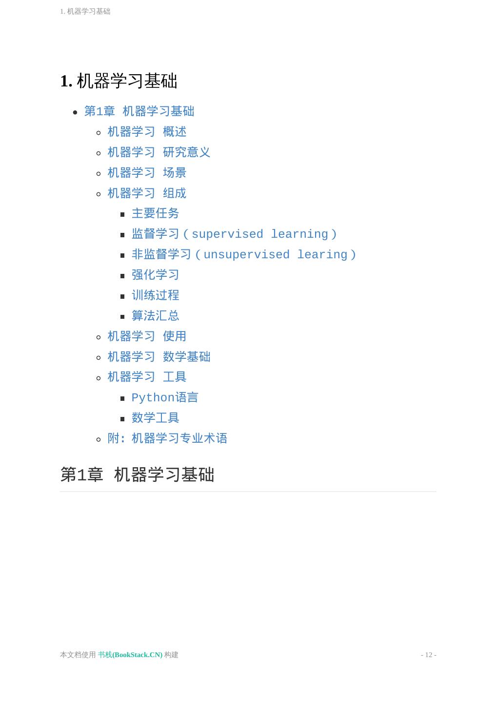 12 .1. 机器学习基础 1. 机器学习基础 第1章 机器学习基础 机器学习 概述 机器学习 研究意义 机器学习 场景 机器学习 组成 主要任务 监督学习(supervised learning) 非监督学习(unsupervised learing) 强化学习 训练过程 算法汇总 机器学习 使用 机器学习 数学基础 机器学习 工具 Python语言 数学工具 附:机器学习专业术语 第1章 机器学习基础 本文档使用 书栈(BookStack.CN) 构建 - 12 -