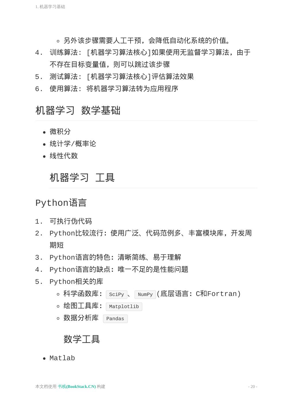 20 .1. 机器学习基础 另外该步骤需要人工干预,会降低自动化系统的价值。 4. 训练算法: [机器学习算法核心]如果使用无监督学习算法,由于 不存在目标变量值,则可以跳过该步骤 5. 测试算法: [机器学习算法核心]评估算法效果 6. 使用算法: 将机器学习算法转为应用程序 机器学习 数学基础 微积分 统计学/概率论 线性代数 机器学习 工具 Python语言 1. 可执行伪代码 2. Python比较流行:使用广泛、代码范例多、丰富模块库,开发周 期短 3. Python语言的特色:清晰简练、易于理解 4. Python语言的缺点:唯一不足的是性能问题 5. Python相关的库 科学函数库: SciPy 、 NumPy (底层语言:C和Fortran) 绘图工具库: Matplotlib 数据分析库 Pandas 数学工具 Matlab 本文档使用 书栈(BookStack.CN) 构建 - 20 -