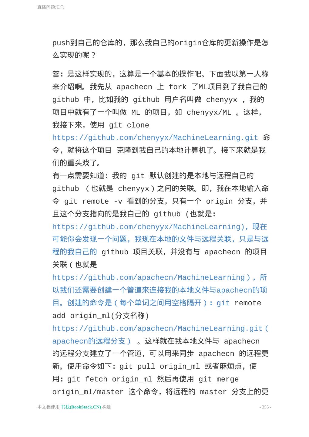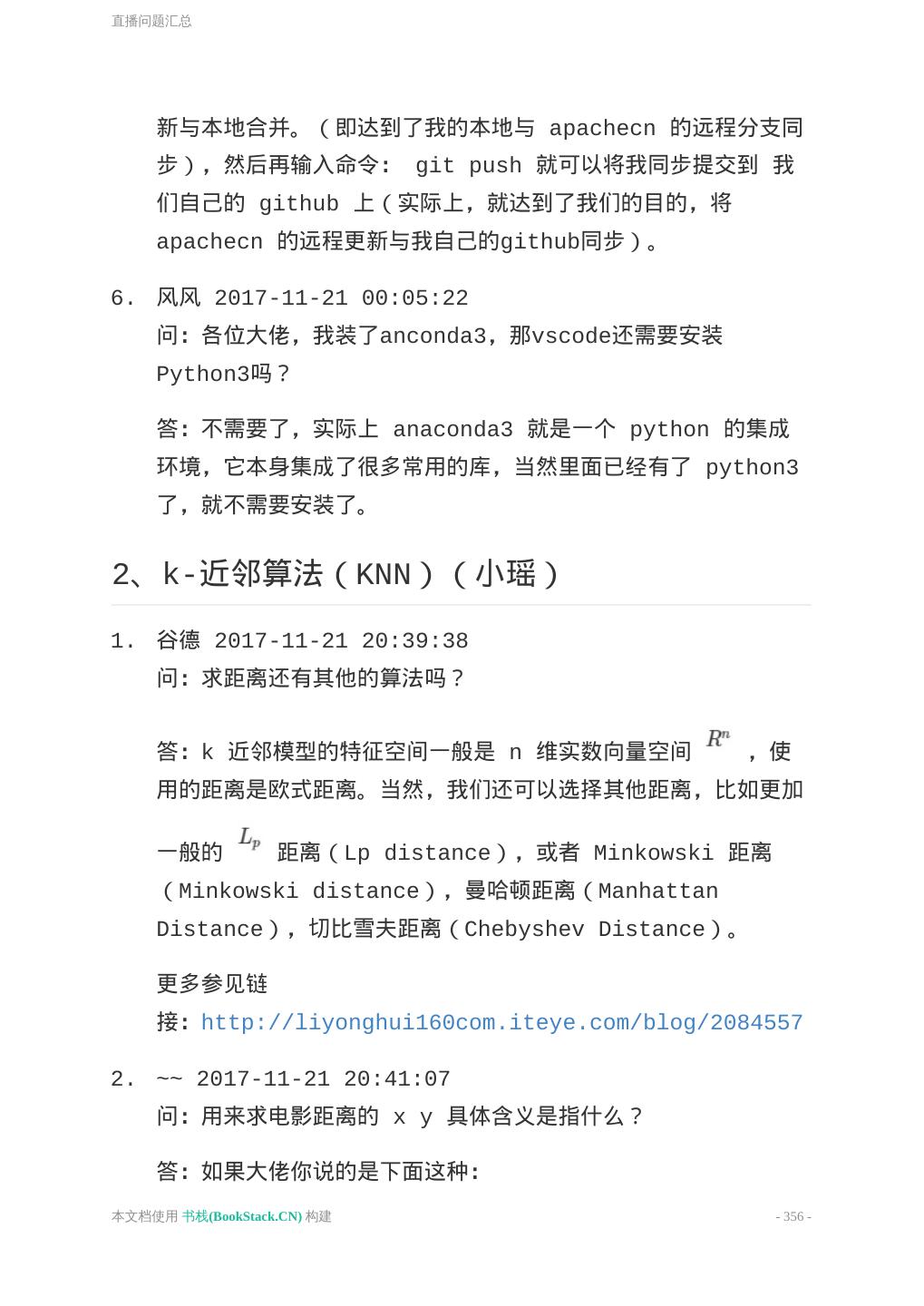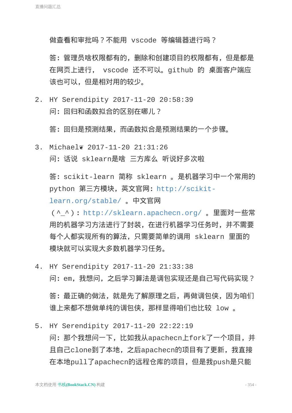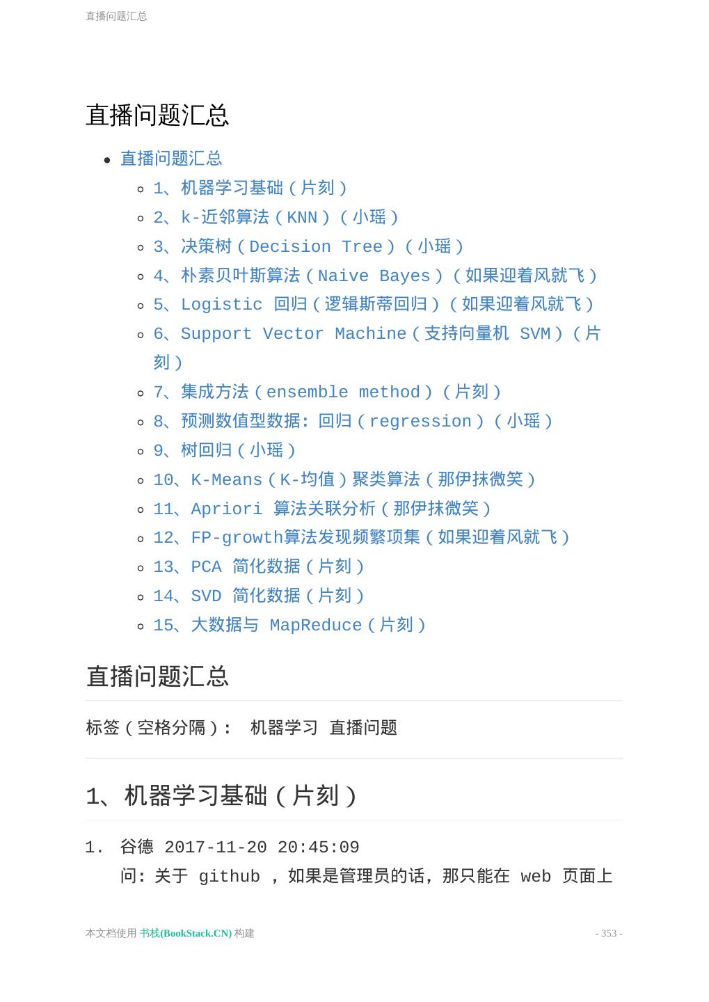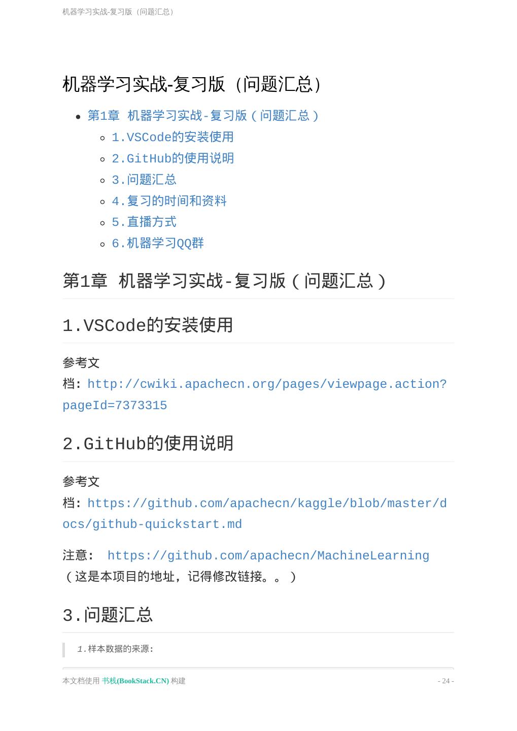 24 .机器学习实战-复习版(问题汇总) 机器学习实战-复习版(问题汇总) 第1章 机器学习实战-复习版(问题汇总) 1.VSCode的安装使用 2.GitHub的使用说明 3.问题汇总 4.复习的时间和资料 5.直播方式 6.机器学习QQ群 第1章 机器学习实战-复习版(问题汇总) 1.VSCode的安装使用 参考文 档:http://cwiki.apachecn.org/pages/viewpage.action? pageId=7373315 2.GitHub的使用说明 参考文 档:https://github.com/apachecn/kaggle/blob/master/d ocs/github-quickstart.md 注意: https://github.com/apachecn/MachineLearning (这是本项目的地址,记得修改链接。。) 3.问题汇总 1.样本数据的来源: 本文档使用 书栈(BookStack.CN) 构建 - 24 -
