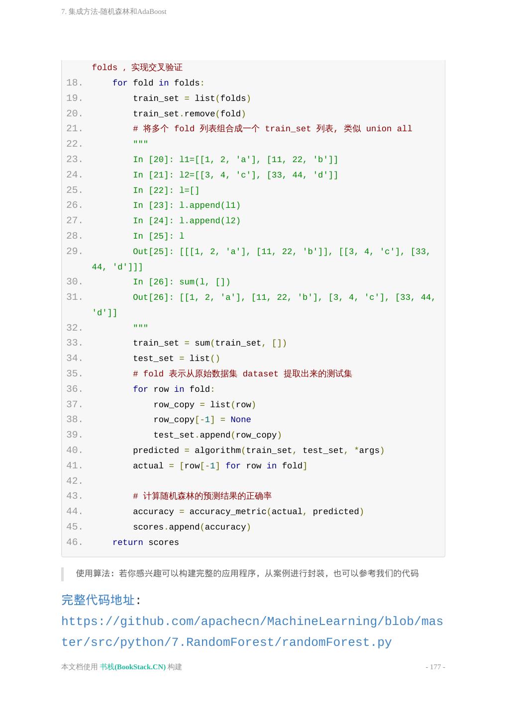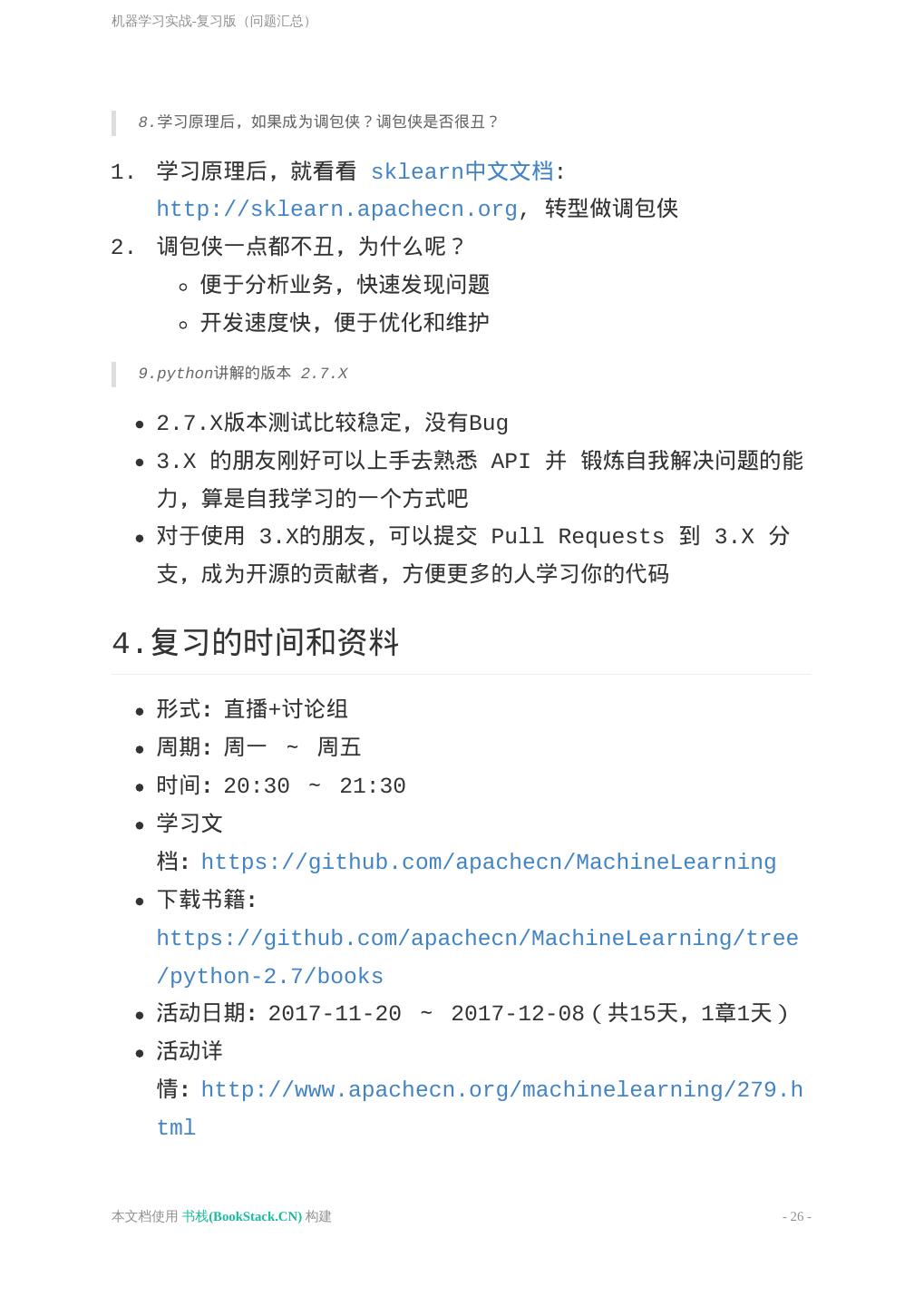 26 .机器学习实战-复习版(问题汇总) 8.学习原理后,如果成为调包侠?调包侠是否很丑? 1. 学习原理后,就看看 sklearn中文文档: http://sklearn.apachecn.org, 转型做调包侠 2. 调包侠一点都不丑,为什么呢? 便于分析业务,快速发现问题 开发速度快,便于优化和维护 9.python讲解的版本 2.7.X 2.7.X版本测试比较稳定,没有Bug 3.X 的朋友刚好可以上手去熟悉 API 并 锻炼自我解决问题的能 力,算是自我学习的一个方式吧 对于使用 3.X的朋友,可以提交 Pull Requests 到 3.X 分 支,成为开源的贡献者,方便更多的人学习你的代码 4.复习的时间和资料 形式:直播+讨论组 周期:周一 ~ 周五 时间:20:30 ~ 21:30 学习文 档:https://github.com/apachecn/MachineLearning 下载书籍: https://github.com/apachecn/MachineLearning/tree /python-2.7/books 活动日期:2017-11-20 ~ 2017-12-08(共15天,1章1天) 活动详 情:http://www.apachecn.org/machinelearning/279.h tml 本文档使用 书栈(BookStack.CN) 构建 - 26 -