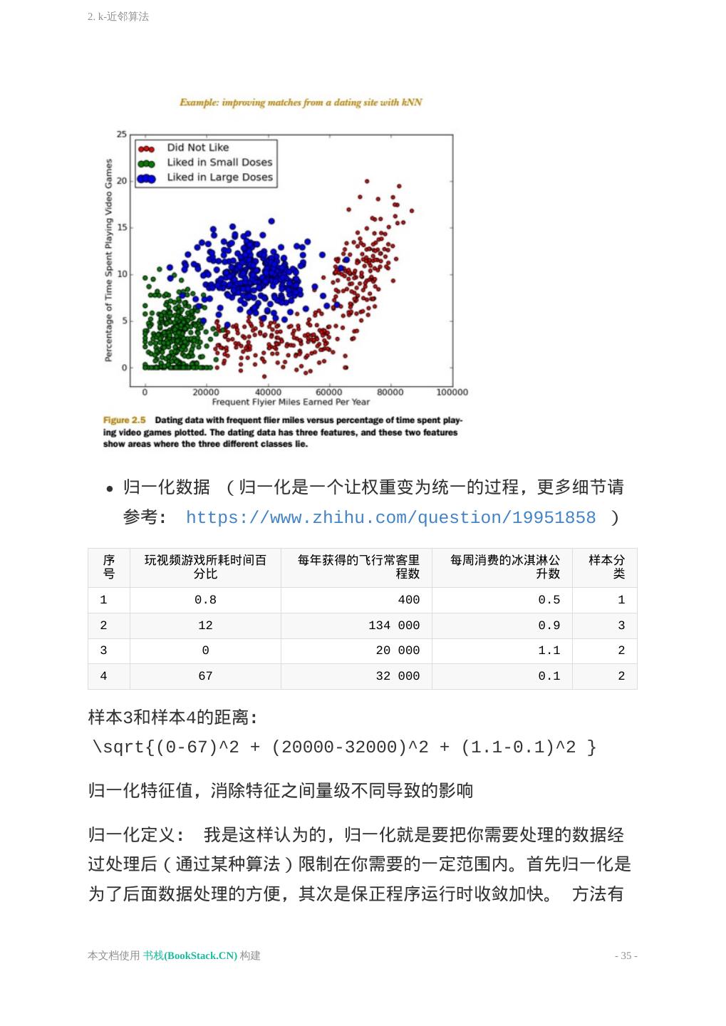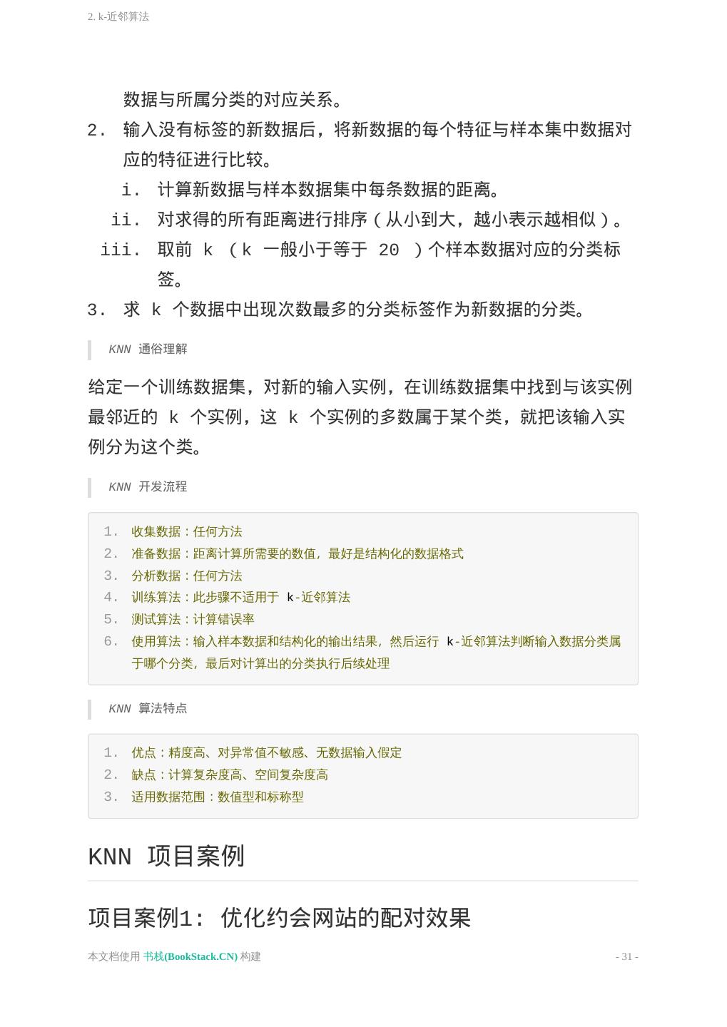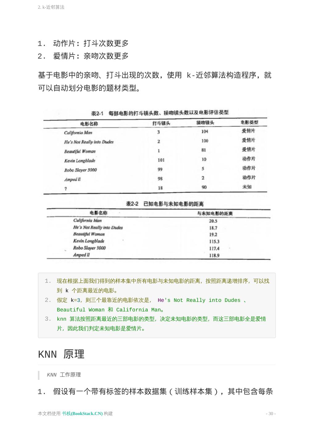 29 .2. k-近邻算法 KNN 概述 k-近邻(kNN, k-NearestNeighbor)算法是一种基本分类与回归方法,我们这里只讨论分类问 题中的 k-近邻算法。 一句话总结:近朱者赤近墨者黑! k 近邻算法的输入为实例的特征向量,对应于特征空间的点;输出为实例的类别,可以取多类。k 近邻算法假设给定一个训练数据集,其中的实例类别已定。分类时,对新的实例,根据其 k 个最近 邻的训练实例的类别,通过多数表决等方式进行预测。因此,k近邻算法不具有显式的学习过程。 k 近邻算法实际上利用训练数据集对特征向量空间进行划分,并作为其分类的“模型”。 k值的选 择、距离度量以及分类决策规则是k近邻算法的三个基本要素。 KNN 场景 电影可以按照题材分类,那么如何区分 动作片 和 爱情片 呢? 本文档使用 书栈(BookStack.CN) 构建 - 29 -