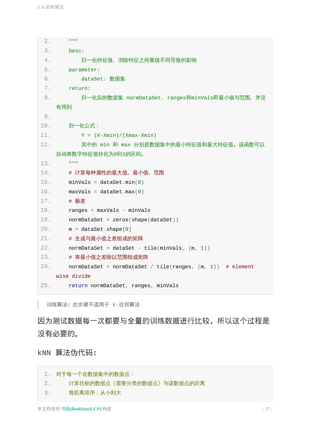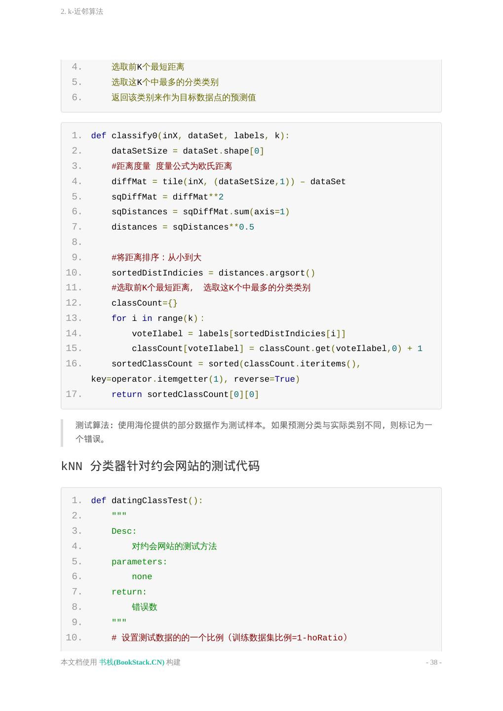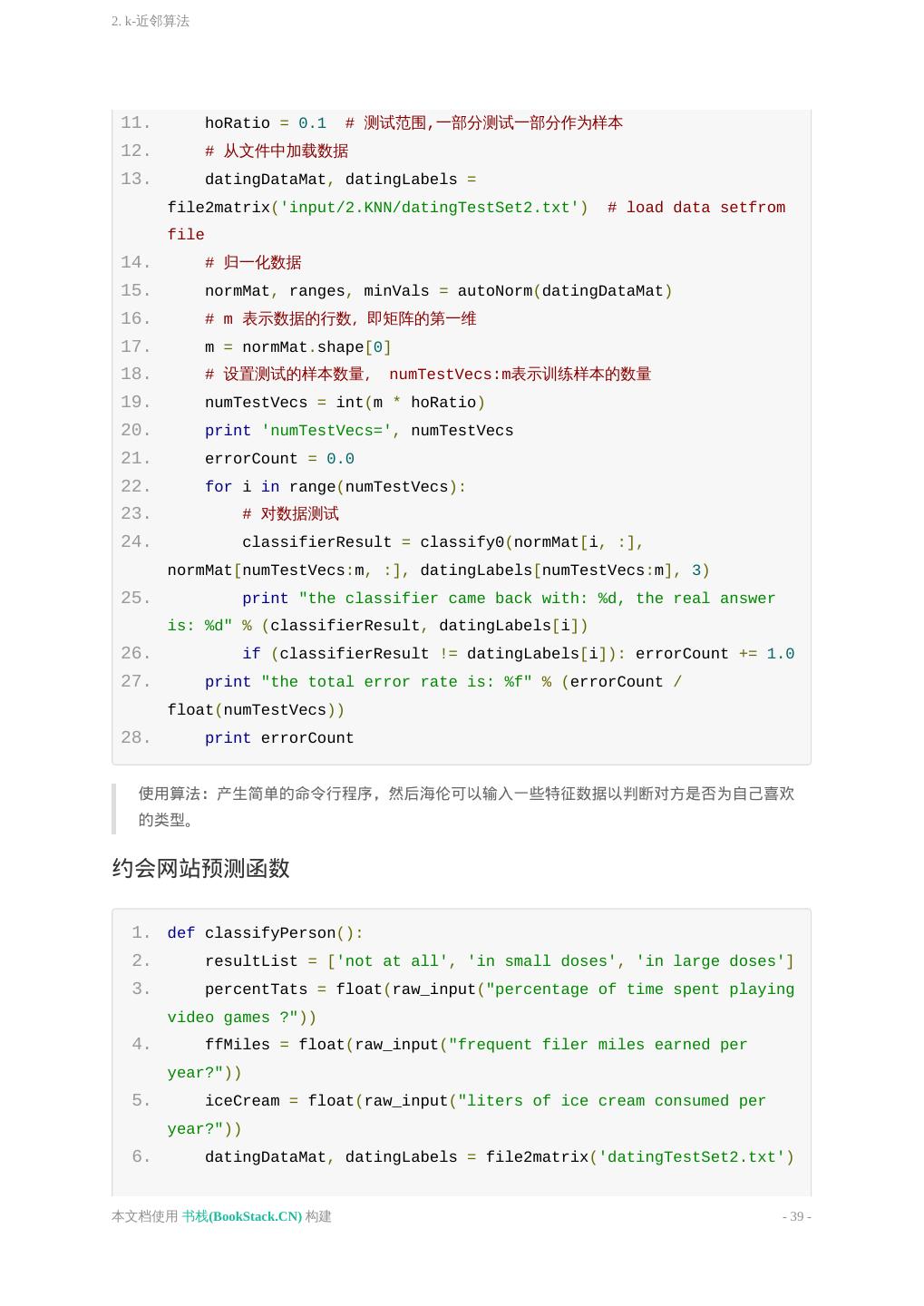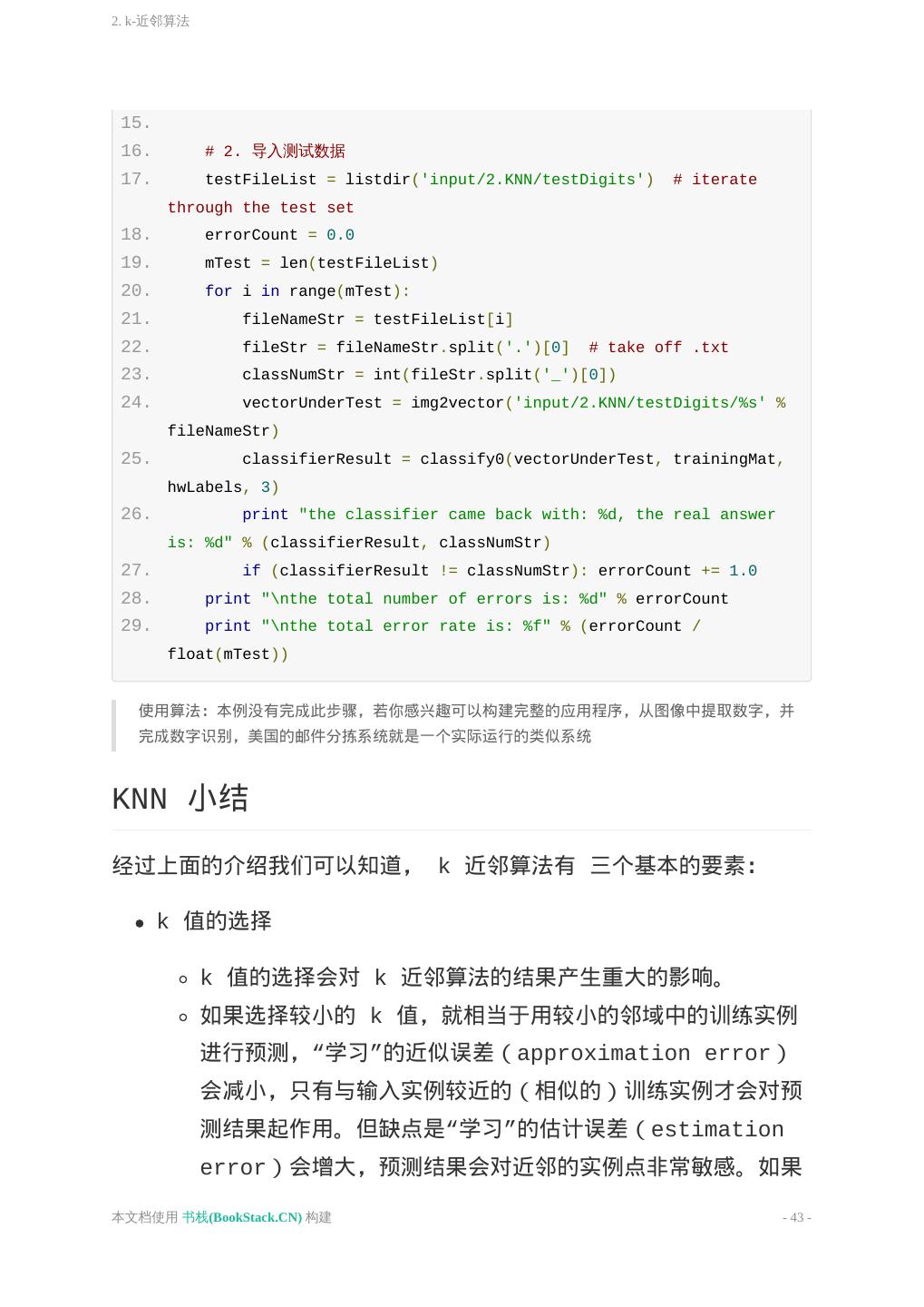 29 .2. k-近邻算法 KNN 概述 k-近邻(kNN, k-NearestNeighbor)算法是一种基本分类与回归方法,我们这里只讨论分类问 题中的 k-近邻算法。 一句话总结:近朱者赤近墨者黑! k 近邻算法的输入为实例的特征向量,对应于特征空间的点;输出为实例的类别,可以取多类。k 近邻算法假设给定一个训练数据集,其中的实例类别已定。分类时,对新的实例,根据其 k 个最近 邻的训练实例的类别,通过多数表决等方式进行预测。因此,k近邻算法不具有显式的学习过程。 k 近邻算法实际上利用训练数据集对特征向量空间进行划分,并作为其分类的“模型”。 k值的选 择、距离度量以及分类决策规则是k近邻算法的三个基本要素。 KNN 场景 电影可以按照题材分类,那么如何区分 动作片 和 爱情片 呢? 本文档使用 书栈(BookStack.CN) 构建 - 29 -